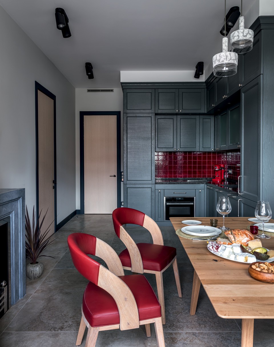 В мир дизайна Ирина Киреева пришла из рекламного бизнеса, где основа всего — концепция, поэтому работу над интерьерами они вместе с коллегой Анной Пискун тоже начинают именно с формулирования главной идеи, а затем уже продумывают детали. Заказчик нашелся в интернете и попросил оформить квартиру в Москве для себя одного. Ему нужна была общая зона кухни и столовой, где можно принимать друзей, отдельная спальня с небольшим рабочим местом, две гардеробные — при спальне и в прихожей — и пара хозяйственных помещений. Декоративное решение дизайнеры искали в альбомах с путешествиями, и именно фотографии природы севера Франции, с ее мрачными серо-зелеными холмами, алебастровыми скалами и холодными каменными улочками небольших нормандских городков и бордово-красными ставнями на окнах подсказали, какой же будет квартира. “Входная и общая зоны, словно эти улочки, вымощены потертым
