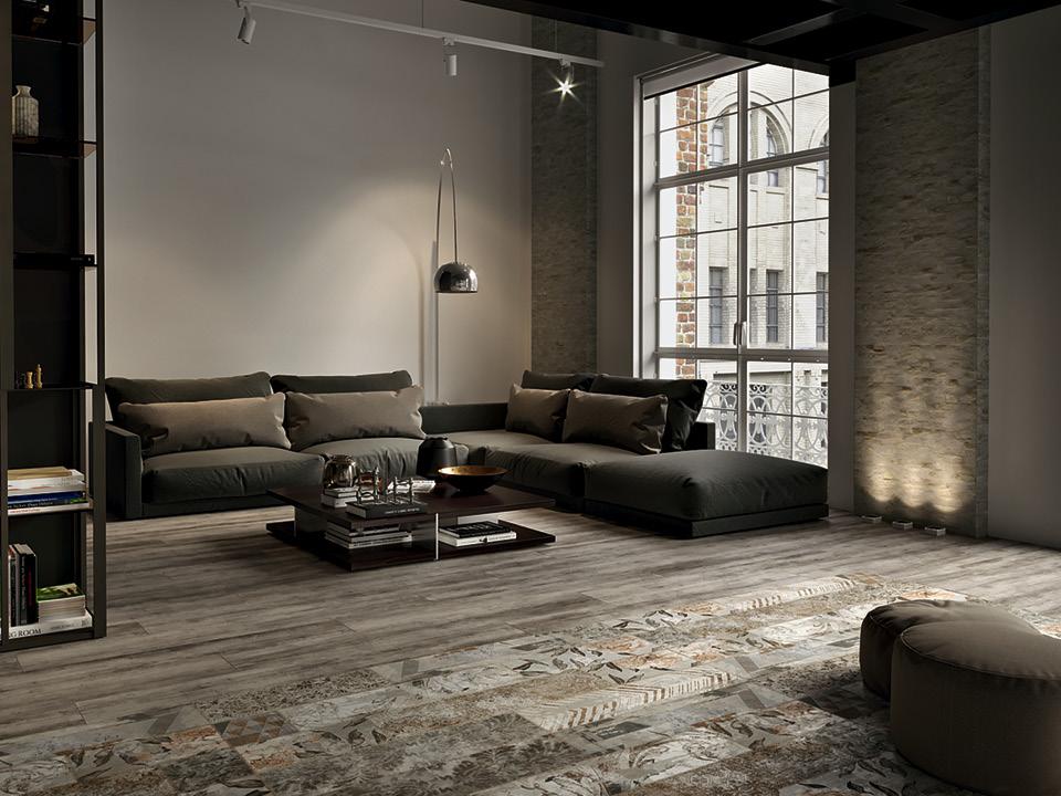 Добиться такой схожести получилось с помощью технологии цифровой печати на структурированной поверхности, которая позволяет воспроизвести структуру и внешний вид древесины, состаренной или просто покрытой маслом, а также текстуру бетона, в обоих случаях керамогранит