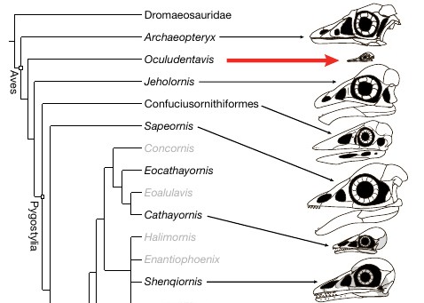 Начнем с научной стороны. Авторы исходной публикации, сотрудники Института палеонтологии позвоночных и палеоантропологии Китайской академии наук во главе с Лида Сином (Lida Xing) и Цзинмай О’Коннор (Jingmai O’Connor), пришли к выводу, что их находка — ее окрестили Oculudentavis khaungraae, «глазастая и зубастая птица» — относится к птицам в широком смысле этого слова, а птицы — это динозавры. Палеонтологи строили филогенетические деревья разными методами и сошлись на том, что Oculudentavis к современным птицам ближе, чем знаменитый археоптерикс, но дальше от них, чем примитивный джехолорнис.