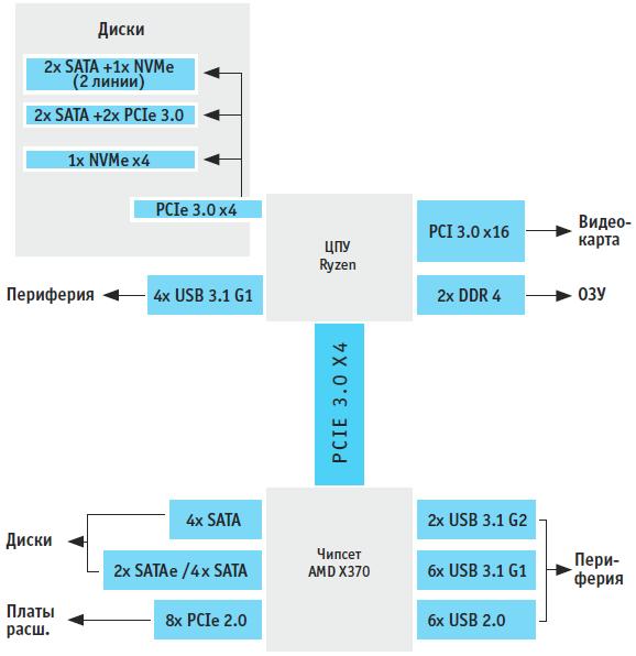 Чипсет материнской платы, соединенный с процессором шиной PCI Express 3.0 x4, требуется только для поддержки дополнительных интерфейсов. Сейчас потребителям доступны три варианта. Топовое решение X370 предоставляет полный набор актуальных интерфейсов (см. блок-схему справа). В моделях с чипсетом B350 не хватает четырех USB-портов типа 3.1 Gen. 2 и двух SATA; также возможно установить лишь одну видеокарту вместо двух (в режиме SLI). Тем не менее чипсеты X370 и B350 допускают возможность разгона. Скудное оснащение предлагают платы на базе A320, у которых отсутствуют дополнительные (реализованные чипсетом) USB- и SATA-порты.