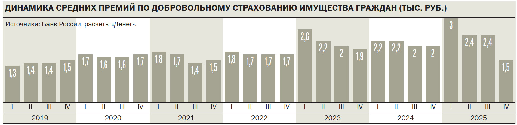 По оценкам замдиректора департамента андеррайтинга и управления продуктами СК «Согласие» Станислава Олейникова, средняя премия по страхованию имущества за 2025 год выросла на 12% — по квартирам на 25%, по домам — на 10%. Основные причины — активное страхование дополнительных рисков, в первую очередь от терактов и военных рисков, а также рост стоимости имущества. «В границах 2026– 2027 годов существенного изменения цен не ожидаем,— прогнозирует эксперт.— Если говорить о более длительном периоде, цены могут как вырасти, так и снизиться — все будет зависеть от экономической и политической ситуации. В частности, если актуальность страхования теракта и военных рисков снизится из-за прекращения военных действий, средний чек пойдет вниз. Если конфликт затянется или усугубится, есть предпосылки для роста». В страховании имущества готовность клиента платить больше напрямую зависит от степени страха перед возможными событиями — крупными стихийными бедствиями и т. п., отмечает Станислав Олейников.