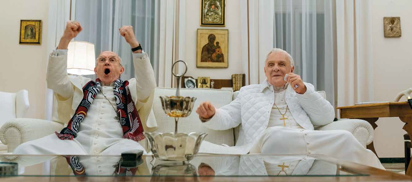 В роли дряхлеющего папы римского Бенедикта XVI снялся Энтони Хопкинс; его идеологического оппонента и будущего преемника Франциска сыграл Джонатан Прайс, знакомый юным зрителям по роли главы деструктивной секты в сериале «Игра престолов». Два этих мощных старика вместе с потрясающими декорациями (в павильоне построили копию Сикстинской капеллы, которая, будем откровенны, выглядит лучше оригинала) делают «Пап» самым красивым фильмом года.