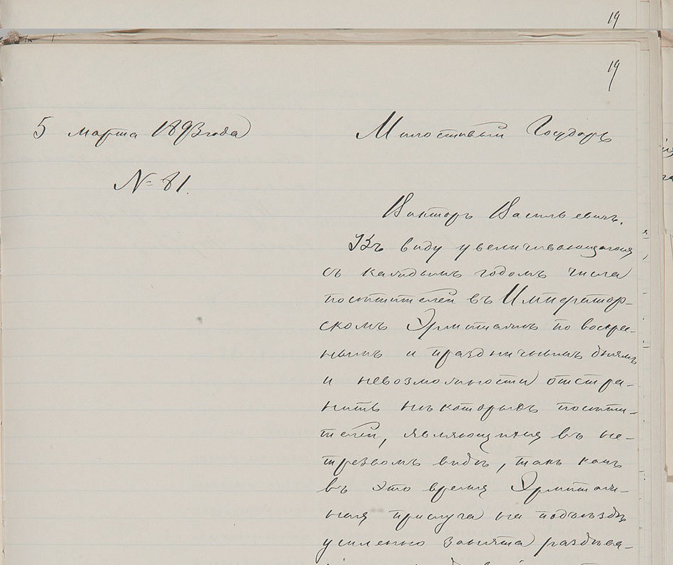 5 марта 1893 года за подписью князя Сергея Трубецкого, заведовавшего в то время Императорским Эрмитажем, было отправлено письмо петербургскому градоначальнику Виктору фон Валю с просьбой о помощи: «Ввиду увеличивающегося с каждым годом числа посетителей в Императорском Эрмитаже по воскресным и праздничным дням и невозможности отстранить некоторых посетителей, являющихся в нетрезвом виде, так как в это время эрмитажная прислуга на подъезде усиленно занята раздеванием и одеванием посетителей и сбережением большого количества верхнего платья, имею честь обратиться к Вашему Превосходительству с покорнейшею просьбою, не признаете ли возможным сделать распоряжение о командировании к Эрмитажному подъезду по воскресным дням, с 1 сентября по 1 июня, околоточного надзирателя или городового, и о последующем не оставить меня уведомлением...» Очевидно, в летние месяцы Эрмитаж справлялся с пьяными собственными силами.