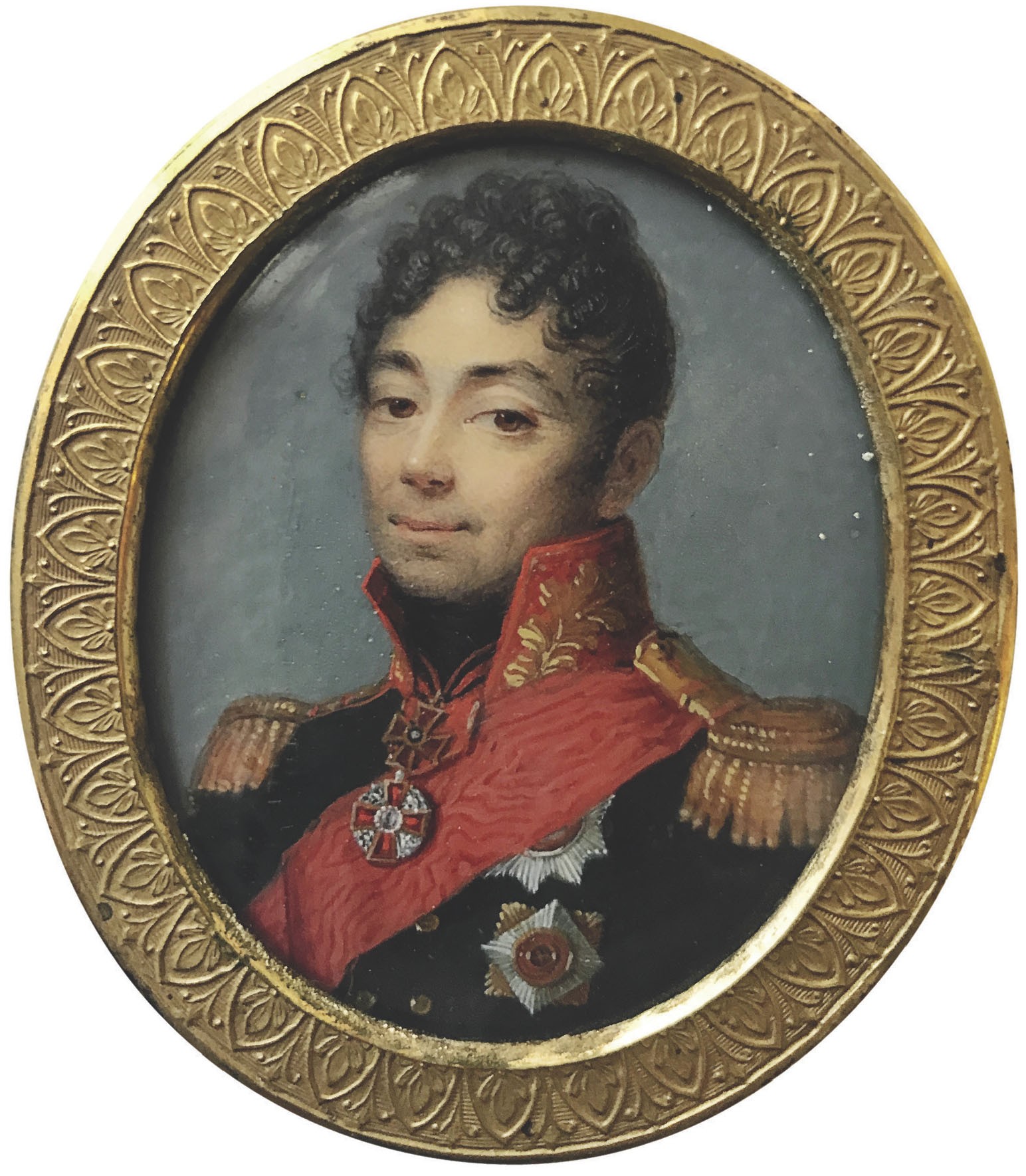Осенью прошлого года при посещении фондов Государственного исторического музея коллеги показали мне несколько миниатюр, имеющих одинаковое оформление оправы. Среди них моё внимание привлёк портрет генерала с очень высокими наградами. На его груди показаны звёзды орденов Святого Александра Невского и Святого Владимира 2-й степени. Через левое плечо надета красная Александровская лента. На шее ниже Владимирского креста виден крупный крест ордена Святой Анны 1-й степени, украшенный алмазами. Уровень наград говорит о том, что на портрете изображён военачальник в чине не ниже генерал-лейтенанта.