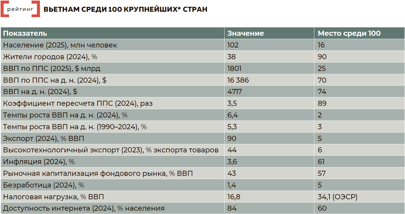 За последние 35 лет Вьетнам прибавлял в среднем по 5,3% в ВВП на душу населения. Это третий лучший результат после Китая и Мьянмы среди сотни крупных стран и в три раза быстрее мировой экономики. В частности, в 2025‑м ВВП Вьетнама прибавил 8% — больше, чем у всех в регионе.