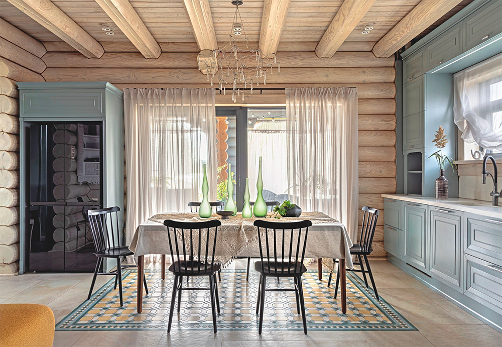 Интерьер дома выстроен на контрасте между массивной архитектурой сруба и лёгкими, почти графичными интерьерными приёмами. Натуральное дерево здесь не маскируют и не «успокаивают» нейтральной отделкой — напротив, с ним вступают в диалог через цвет, орнамент и предметы с ярко выраженным характером. Такой микс, смешение разных стилей и культур формирует эклектичный, но собранный образ «сказочного терема» в современной интерпретации. Отсылки к сказочной образности читаются в декоративных мозаичных панно на полу, в выразительной мебели санузлов, в рисунке обоев на перегородке в гостевой комнате, в принтах на текстиле в детской. Эти элементы работают как единая система визуальных акцентов, формируя многослойный интерьерный сценарий.