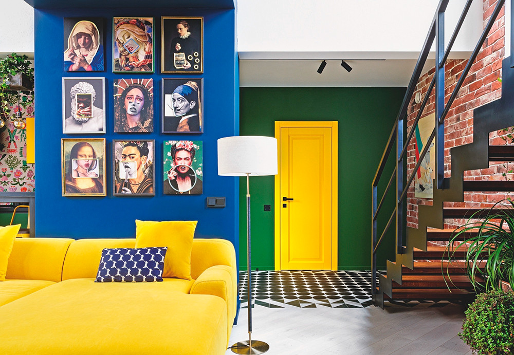 Заказчики — молодая творческая пара — изначально задали непростую палитру: травянисто-зелёный, глубокий синий и ярко-жёлтый. Перед дизайнером стояла задача органично объединить эти оттенки в единую композицию. Так в интерьере появился жёлтый диван, ставший акцентом кухни-гостиной, а в его поддержку — другие выразительные элементы того же цвета: кухонный модуль, межкомнатная дверь, наличники. Все они вписаны в продуманную систему цветовых переходов, где цвет выступает полноценным архитектурным инструментом.