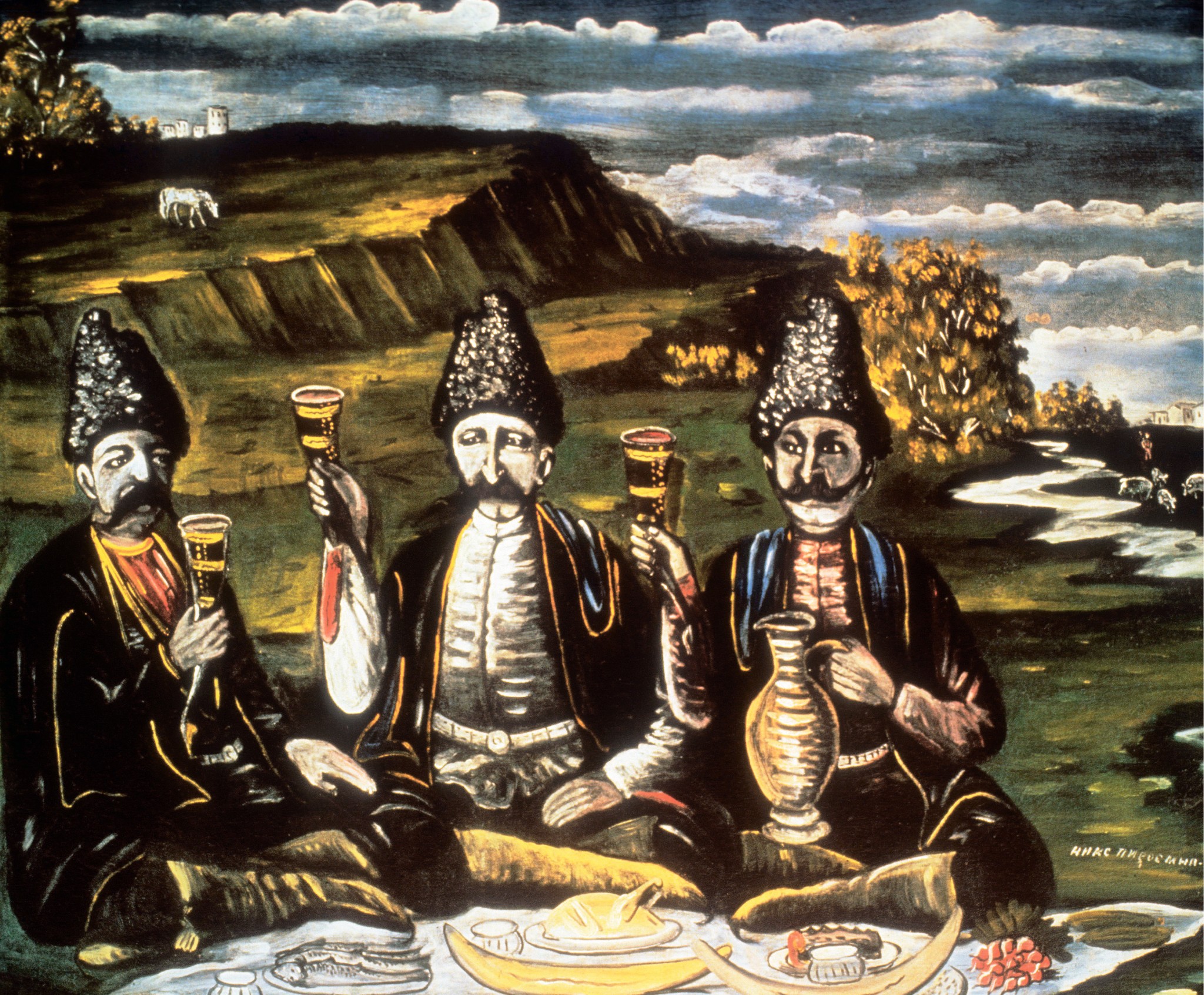 Молодые люди заняли столик у окна, сделали заказ и только тут заметили, что все стены кабачка увешаны картинами — странными, но завораживающими. Столичные гости поспешили их разглядеть: «Отшельник Георгий», «Царица Тамар», «Шота Руставели», «Ираклий II», «Трактирщик с приятелями в виноградной беседке», «Грузин с рогом для вина», «Пастух в бурке»... С этих работ, написанных не на холсте, а на материале, напоминающем толстую клеенку, смотрела подлинная Грузия, древняя и современная. Изумленные и растерянные, приятели переходили от одной картины к другой, не в силах сдержать восторгов: «Кто этот художник? Где его можно найти?» Подобной живописи они никогда не видели. Кисть выдавала непрофессионала, но самобытность дарования покоряла.