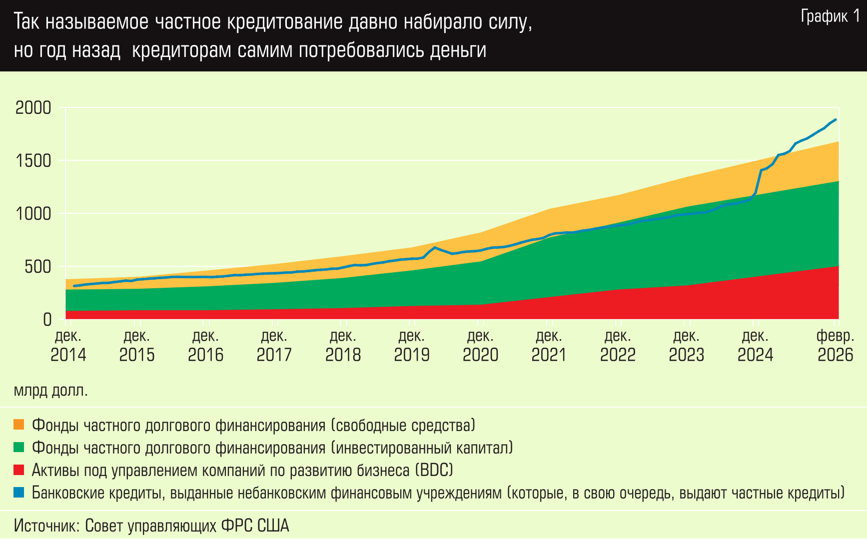 Действительно, если посмотреть на статистику, то окажется, что объем банковских кредитов небанковским финансовым учреждениям вырос с 325 млрд долларов на начало 2015 года до 1,87 трлн на конец февраля 2026-го, или с 218 млрд до 1,38 трлн долларов, если брать только банки, имеющие американскую лицензию и выполняющие все положенные в США нормы регулирования (см. график 1). Рост просто гигантский, и по нему можно судить об активности в сфере частного кредита.