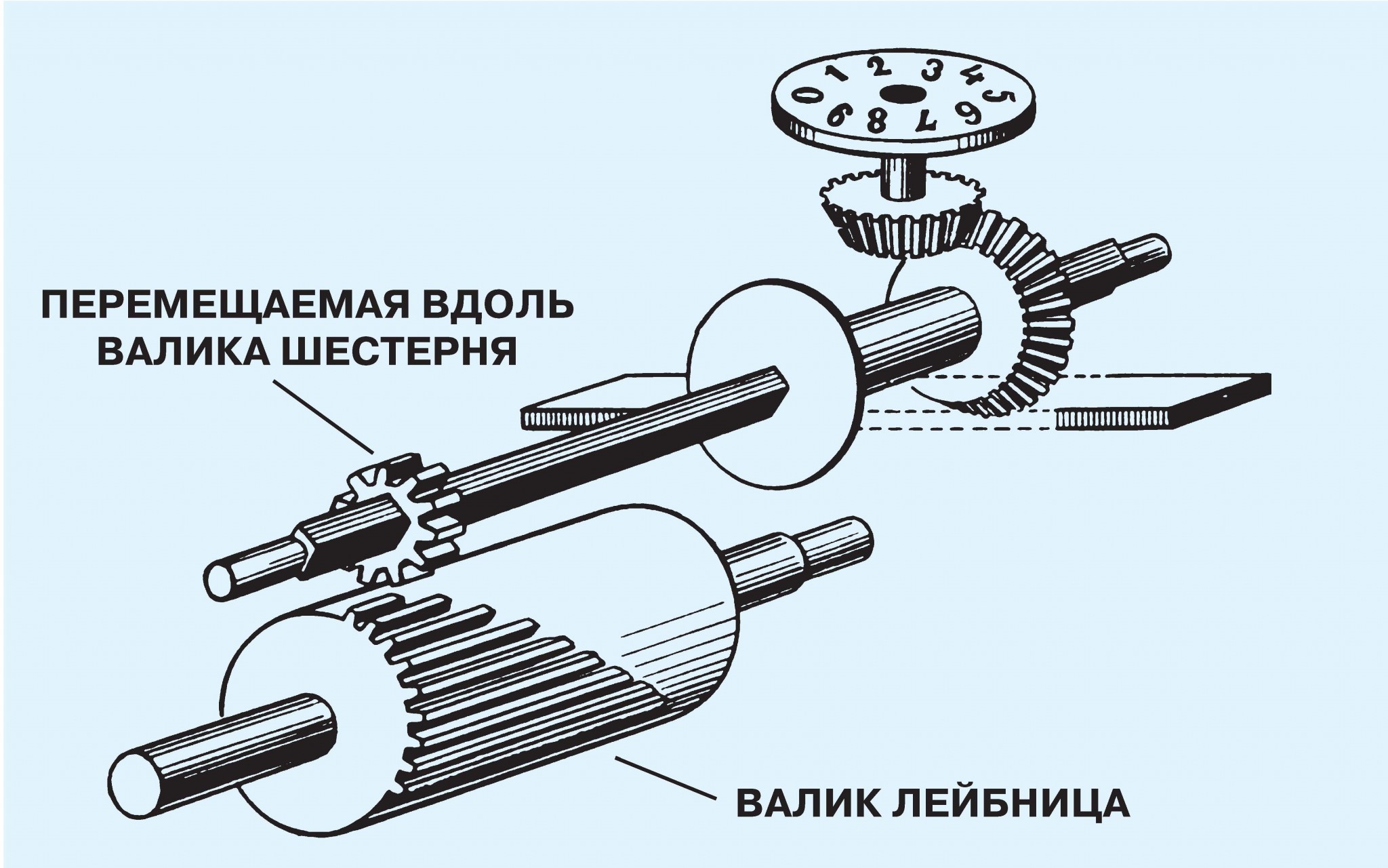 Хорошо работающее решение всех этих задач первым нашёл великий немецкий учёный-энциклопедист Готфрид Вильгельм Лейбниц (1646—1716). Для передачи чисел на колёса-счётчики Лейбниц придумал ступенчатый валик (см. рисунок). Ступеньки на валике, играющие роль зубьев, имели разную длину, поэтому, перемещая пере-дающую шестерню вдоль валика, можно было размещать её в зоне с разным числом ступенек. В начале валика под ней оказывались все 9 ступеней, и один оборот валика заставлял счётчик поворачиваться на 9 зубьев. Где-то в середине валика было, скажем, 5 ступеней, и один его оборот смещал счётчик уже на 5 зубьев. Таким образом, на каждом валике устанавливалась своя цифра числа, например, для числа 863 на первом валике передающая шестерня смещалась в область с 3 ступеньками, на втором — на 6, а на третьем — на 8. Теперь все валики одновременно поворачивались рукоятью и передавали на счётчик число 863.