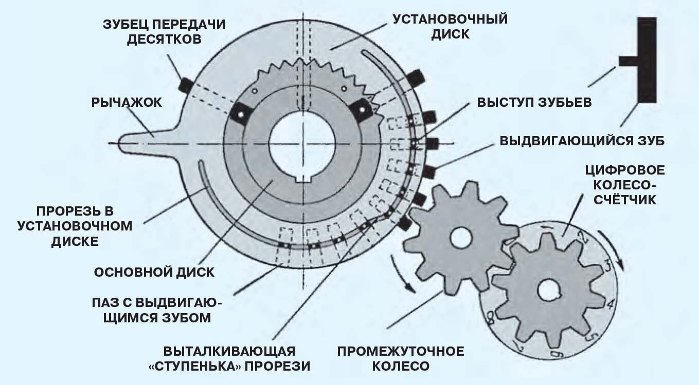 Итак, представим себе зубчатое колесосчётчик с десятью зубьями, с каждым из которых связана цифра, показываемая в окошке. Если изначально в окошке видна цифра 0, то, повернув колесо на три зуба, мы увидим в окошке уже цифру 3. А теперь, повернув колесо счётчика ещё на 4 зуба, мы увидим в окошке 3 + 4 = 7. Таким образом, реализуется сложение с помощью зубчатого колеса. Легко догадаться, что вычитание производится поворотом колеса в другую сторону. Например, 7 зубьев вперёд, а затем 5 назад, и в окошке появится 7 – 5 = 2. Умножение на целое число сводится к повтору поворотов: четыре раза по два зуба — и в окошке появится 2 х 4 = 8.