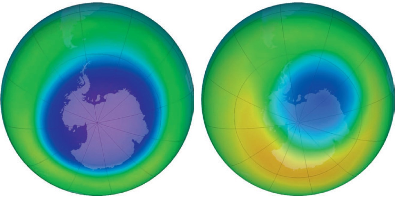 Рекордное разрушение озонового слоя, защищающего человека, животных и растения от повышенных уровней ультрафиолетовой радиации, было обнаружено над Антарктикой в начале 1980-х годов японскими и британскими исследователями с помощью наземных измерений и по результатам баллонных запусков, которые затем подтвердились спутниковыми наблюдениями. Значительное сокращение озонового слоя назвали Антарктической озоновой аномалией (или озоновой дырой). Уменьшение общего содержания озона (до 50%, а на некоторых уровнях в стратосфере — до 90%) ежегодно происходит в сентябре—ноябре, то есть в весенний период для Южного полушария.