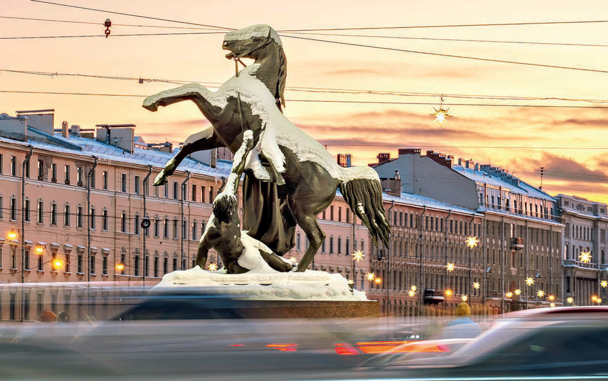 Знаменитая скульптура «Юноша, поверженный конем» на Аничковом мосту и вид на набережную реки Фонтанки СанктПетербурга. Город занимает 4-е место в Националь- ном туристическом рейтинге.