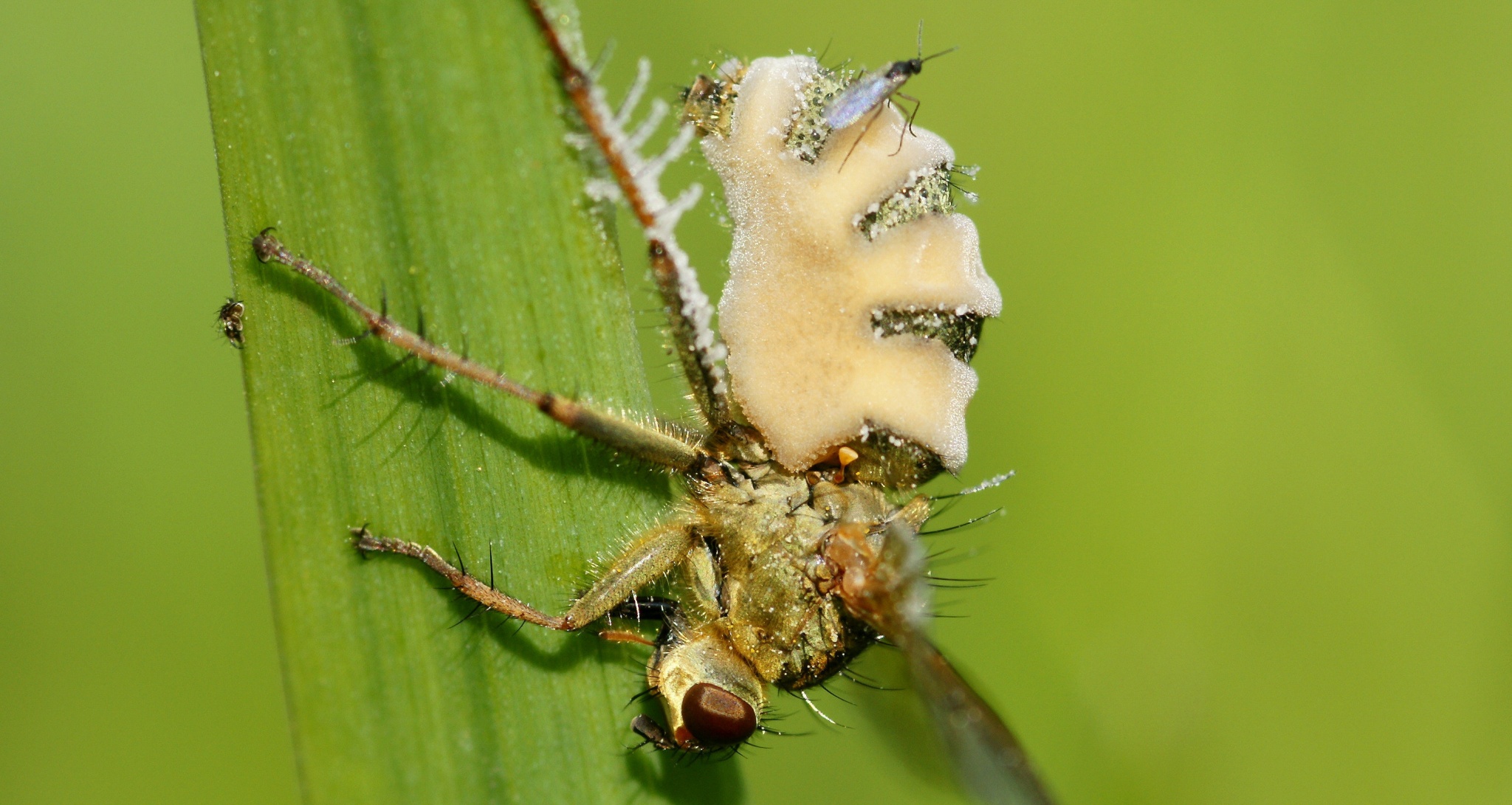 Биологи из Калифорнии открыли необычный грибок, который проникает в мозг плодовых мушек-дрозофил и превращает их в послушных зомби, распространяющих его среди здоровых насекомых
