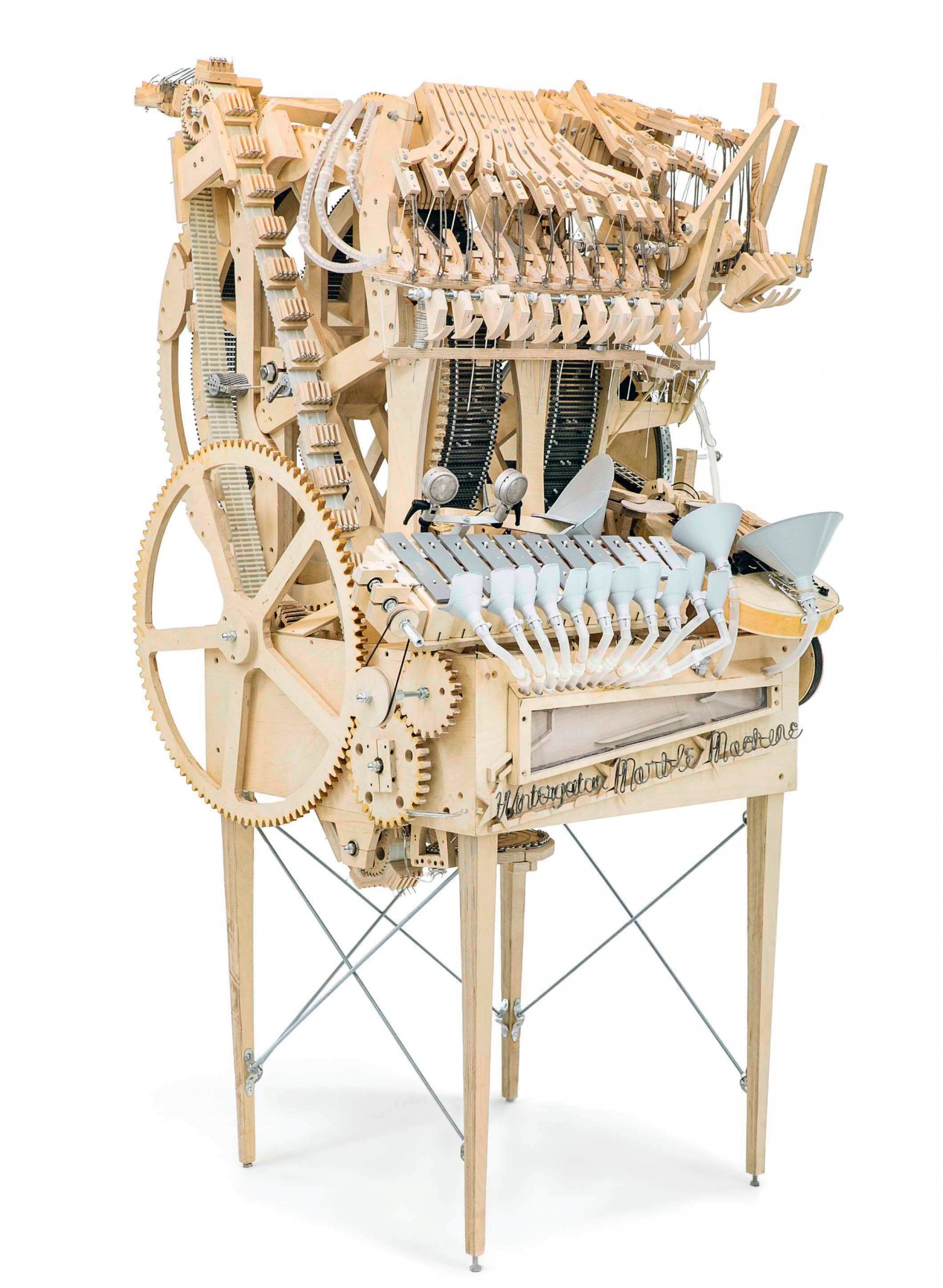 «ШАРИКОВАЯ МАШИНА X» МАРТИНА МОЛИНА (Martin Molin’s Marble Machine X) – это нечто вроде шарманки, где основная задача музыканта – раскручивать деревянные барабаны, которые в свою очередь приводят в движение систему подъема наверх 2000 металлических шариков (как от подшипника). Шарики затем скачут вниз, ударяя по звенящим пластинам, коже барабанов и даже по струнам бас-гитары. Получается музыка.