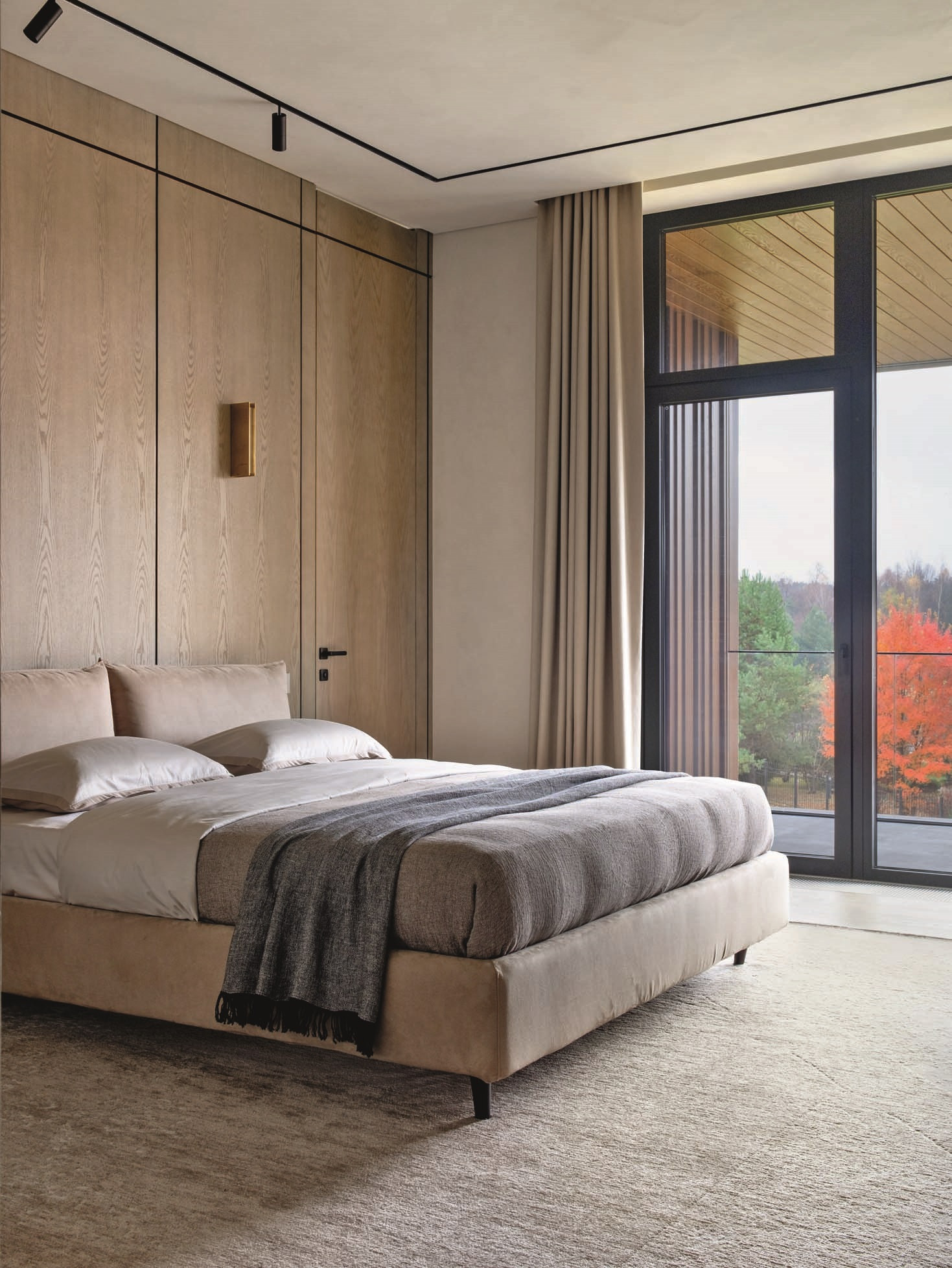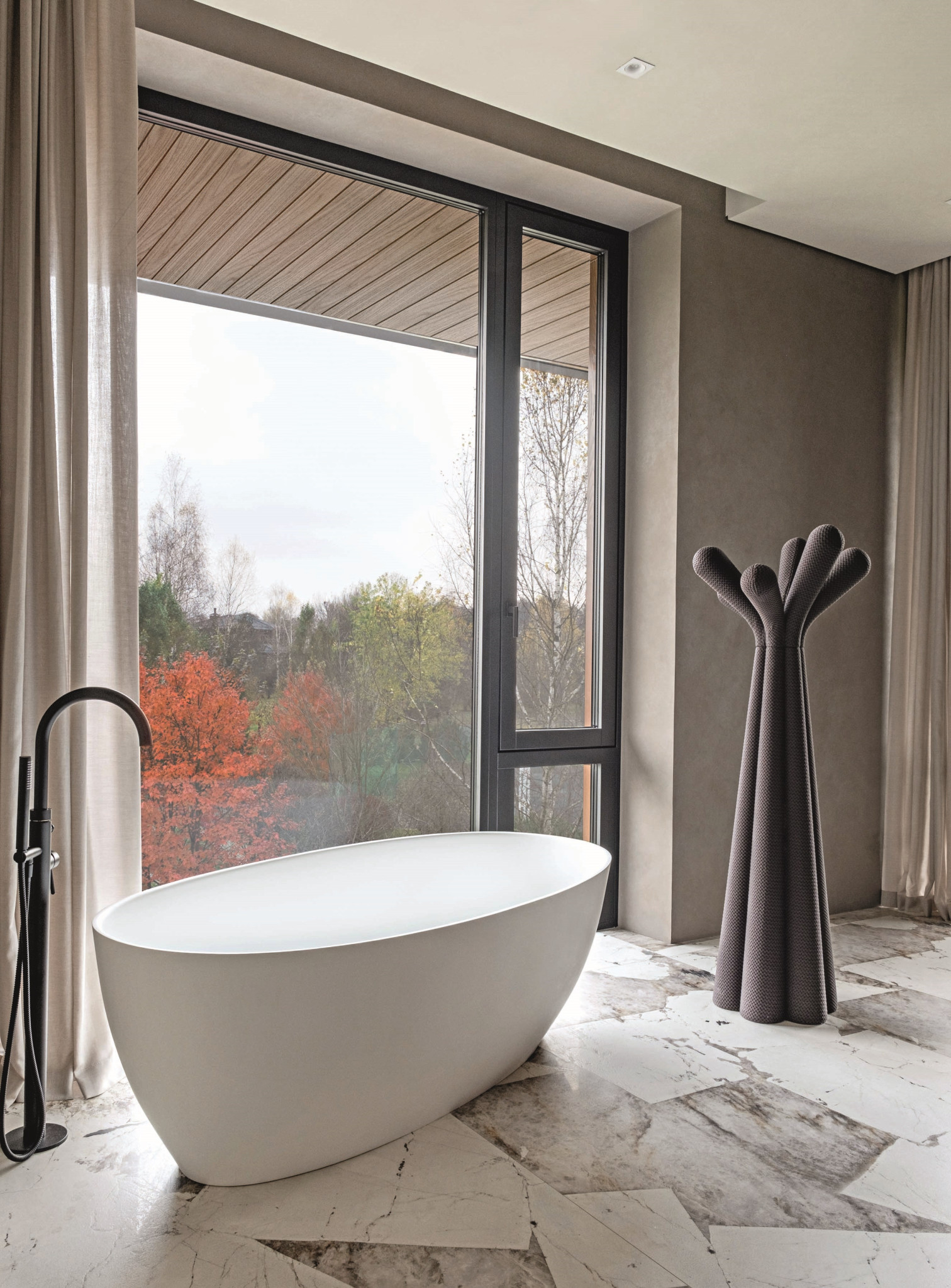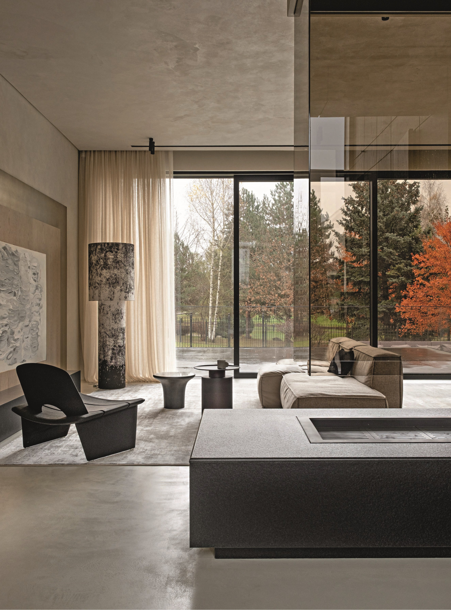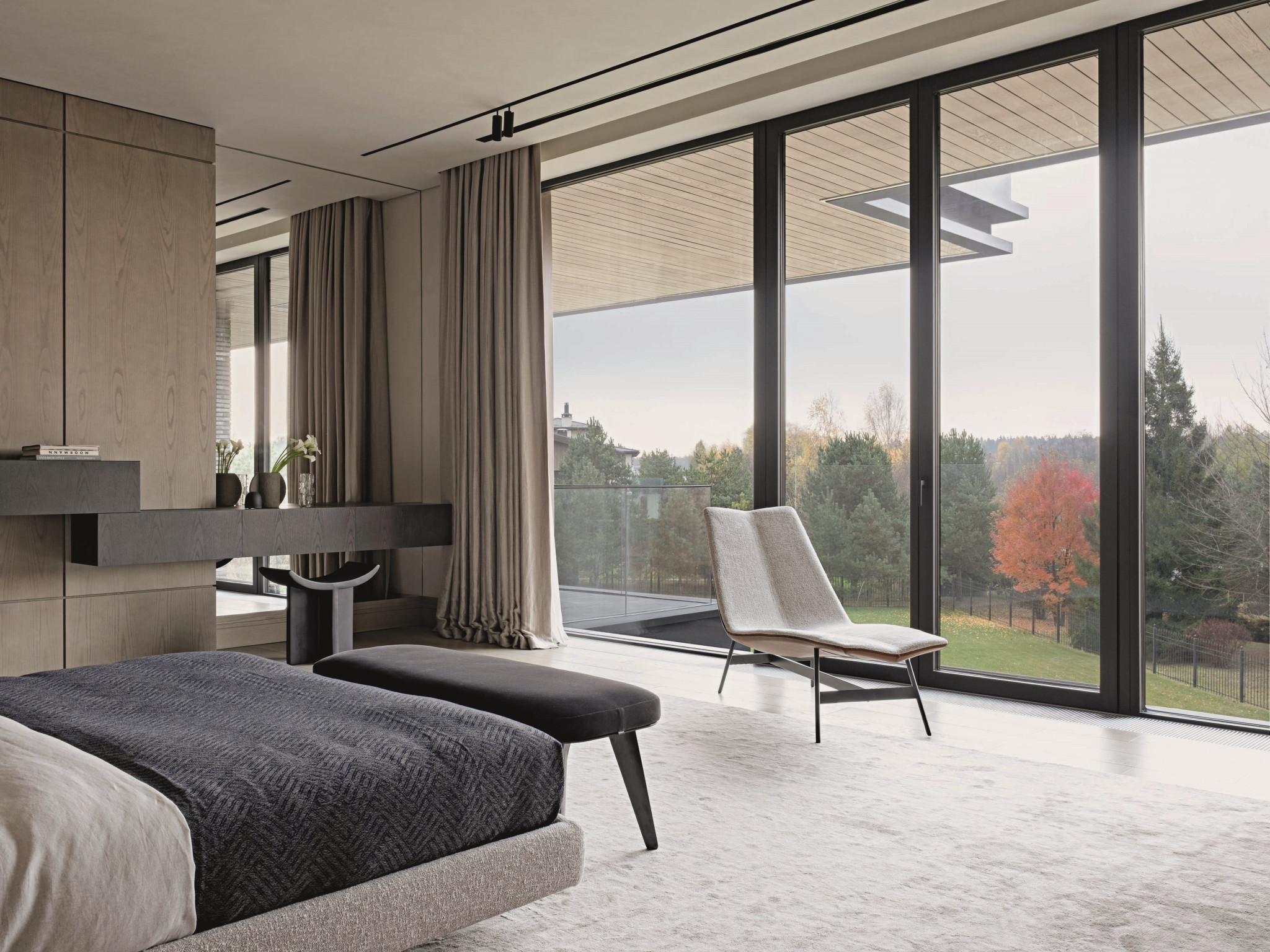 Сложные спокойные оттенки, природные материалы, визуальная чистота, интегрированные системы хранения — самые актуальные решения в современном интерьере, но для дизайнера было важно не просто использовать модные приемы, а «прожить» тренд на тишину и натуральность. «Сегодня людям всё чаще нужен не интерьер как демонстрация, а интерьер как опора: пространство, где можно выдохнуть, восстановиться, почувствовать устойчивость и качество жизни. Особенно ясно это проявляется в загородных домах, где сама среда — природа, свет, удаленность от города — подсказывает более спокойный и глубокий сценарий».