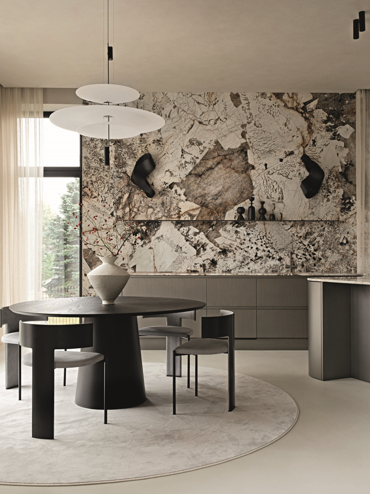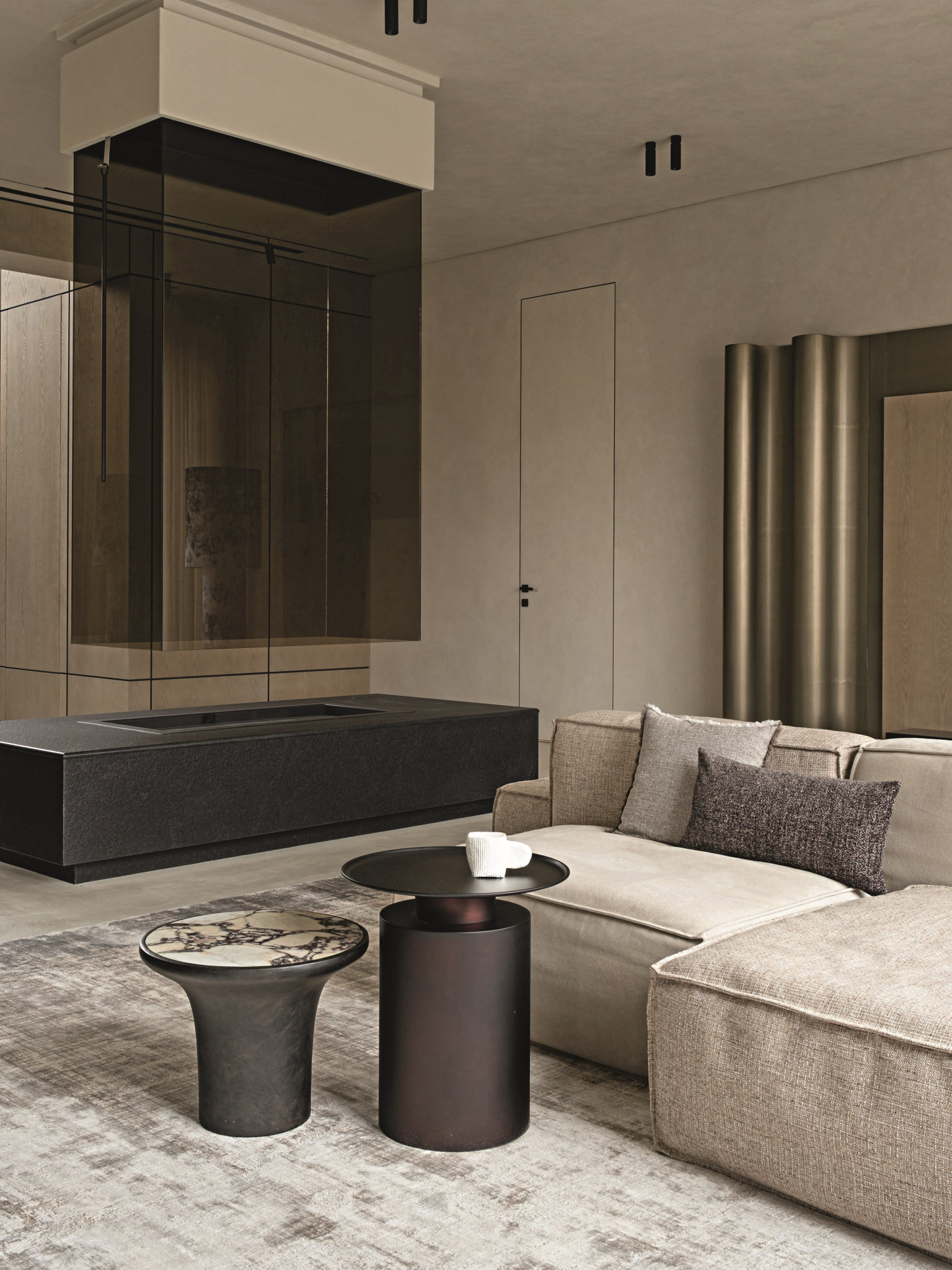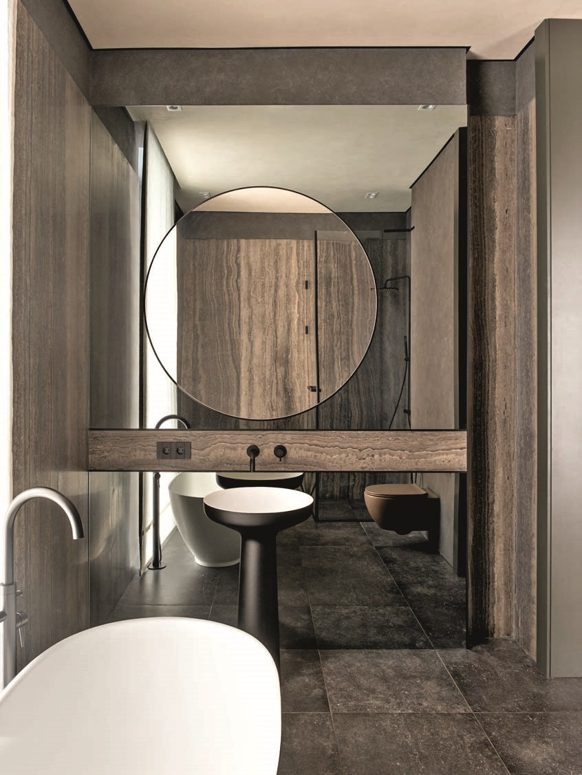 Проект получился благородным и зрелым. Заказчики хотели сделать дом статусным, но избежать излишней роскоши и визуального шума, поэтому Юлия Мозгунова сделала ставку на тактильность, сдержанность и вневременный характер интерьера. Натуральный камень, шпон, крупные объемы выглядят лаконично, но не холодно, а картины и скульптуры не претендуют на главенство, мягко подчеркивая выбранную стилистику. «Интерьер не стремится впечатлить мгновенным эффектом, а раскрывается постепенно: через пропорции, свет, тактильность поверхностей, ритм плоскостей и качество материалов, — делится дизайнер. — Стилистически он находится в поле теплого минимализма с архитектурным подходом. При этом лаконичность для меня не означает эмоциональную нейтральность». Архитектурность требовала деликатного освещения: оно не спорит с архитектурой, а выявляет фактуры и глубину материалов и меняет характер пространства в течение дня, делая дом по-настоящему живым.