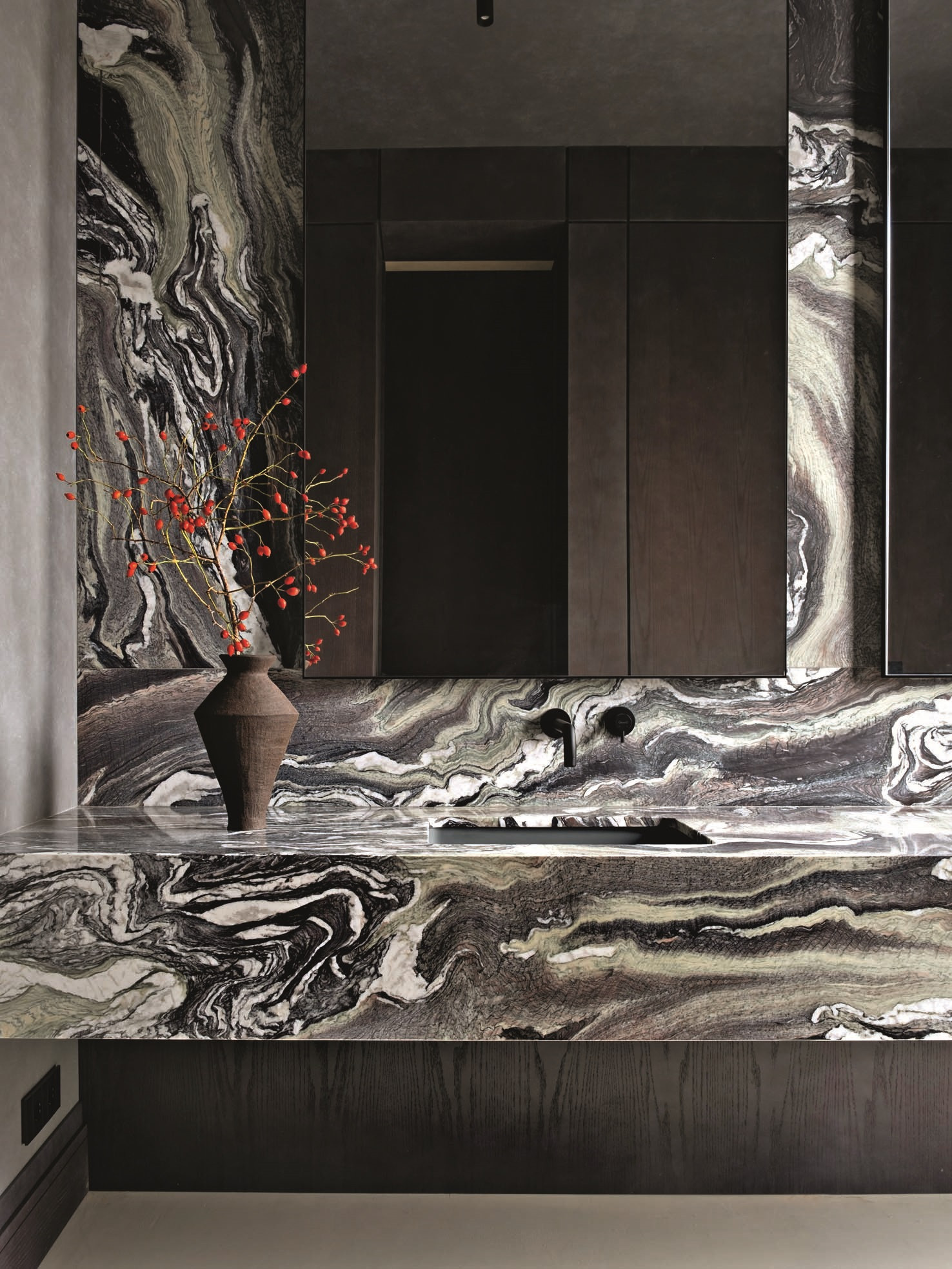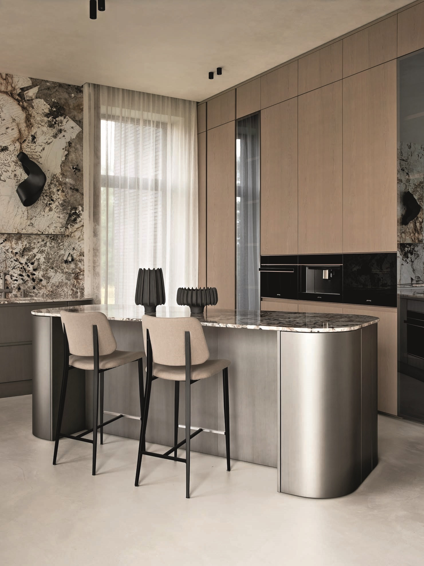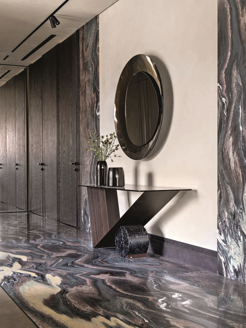 Проект получился благородным и зрелым. Заказчики хотели сделать дом статусным, но избежать излишней роскоши и визуального шума, поэтому Юлия Мозгунова сделала ставку на тактильность, сдержанность и вневременный характер интерьера. Натуральный камень, шпон, крупные объемы выглядят лаконично, но не холодно, а картины и скульптуры не претендуют на главенство, мягко подчеркивая выбранную стилистику. «Интерьер не стремится впечатлить мгновенным эффектом, а раскрывается постепенно: через пропорции, свет, тактильность поверхностей, ритм плоскостей и качество материалов, — делится дизайнер. — Стилистически он находится в поле теплого минимализма с архитектурным подходом. При этом лаконичность для меня не означает эмоциональную нейтральность». Архитектурность требовала деликатного освещения: оно не спорит с архитектурой, а выявляет фактуры и глубину материалов и меняет характер пространства в течение дня, делая дом по-настоящему живым.