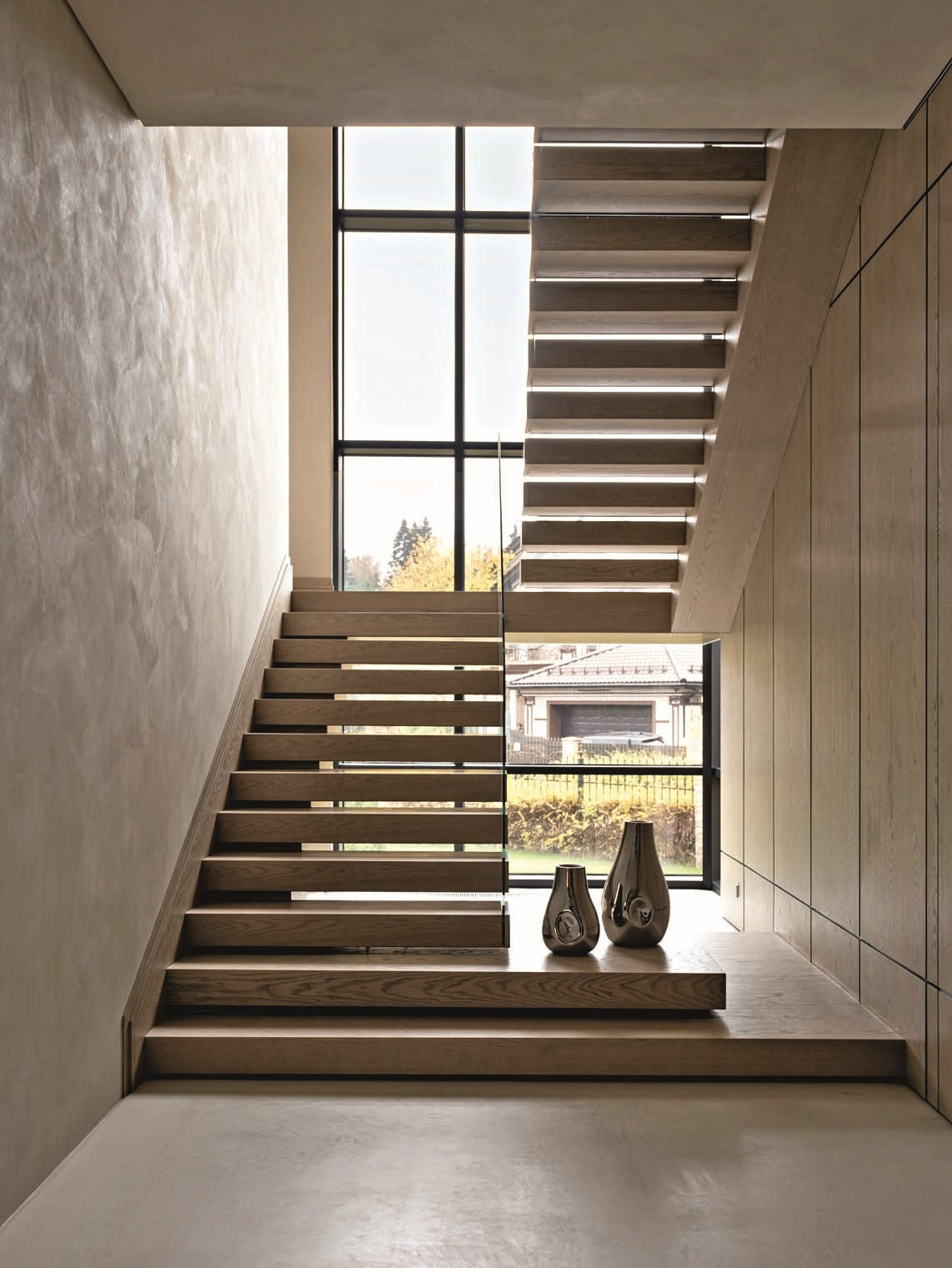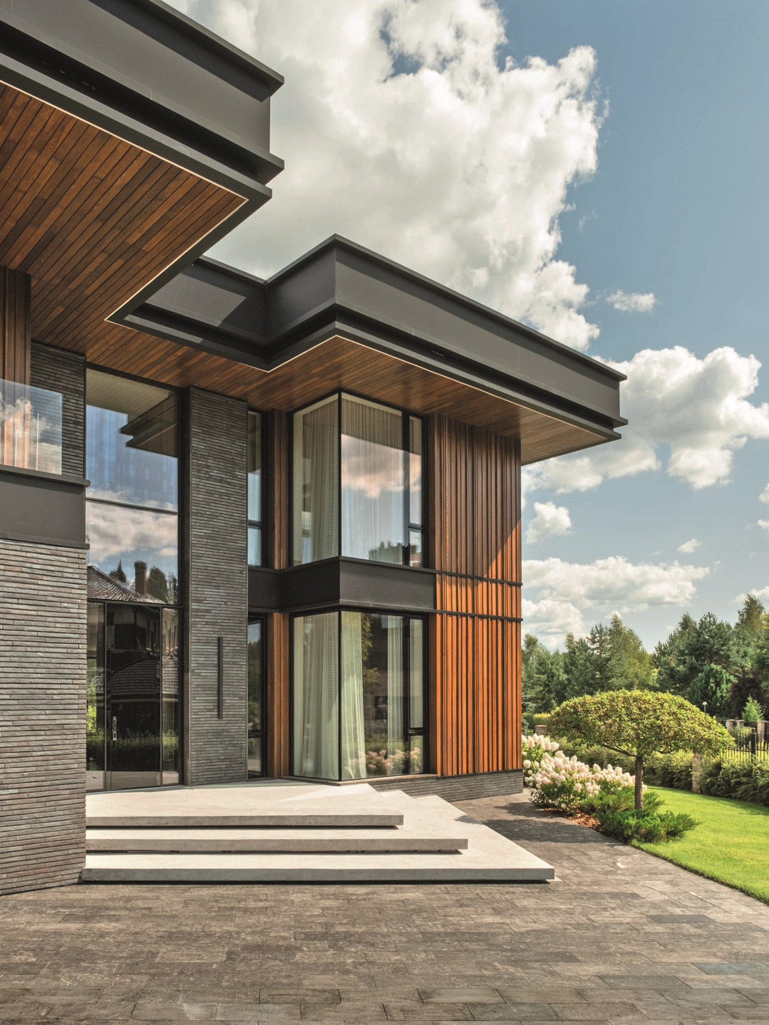 Интерьер во многом отталкивался от ландшафта: все основные видовые окна выходят на внутренний двор и парк, а природное окружение становится частью повседневного сценария
