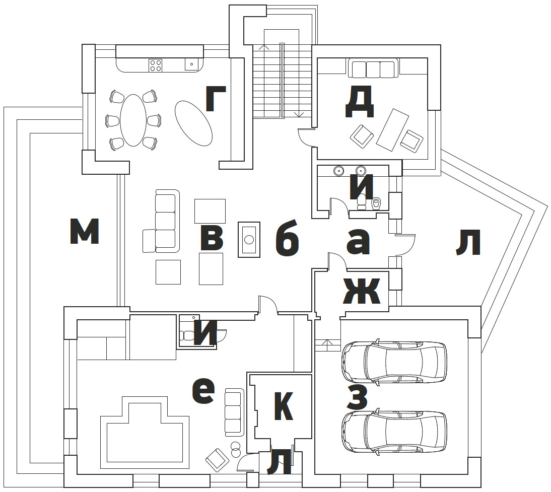 I этаж: а) прихожая, б) коридор, в) гостиная, г) кухня-столовая, д) кабинет, е) спа-зона, ж) гардеробная, з) гараж, и) санузлы, к) техпомещение, л) крыльцо, м) терраса.