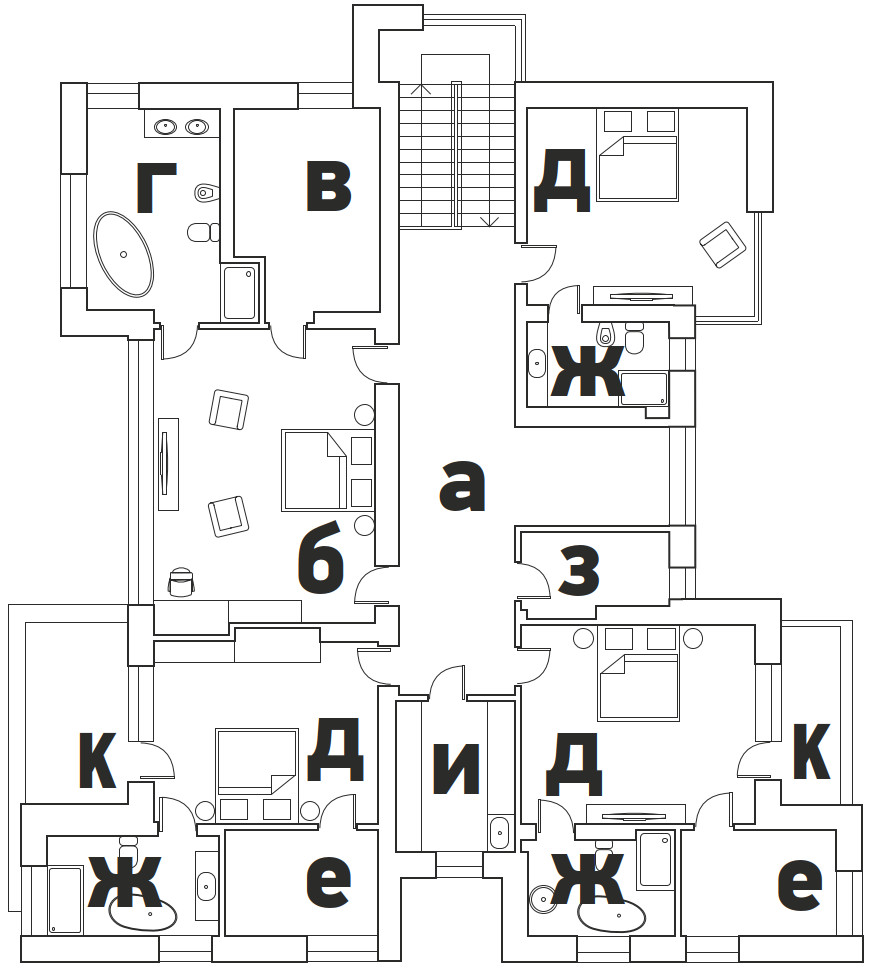 II этаж: а) холл, б) спальня хозяев, в) гардеробная, г) ванная комната, д) гостевые спальни, е) гардеробные при гостевых спальнях, ж) гостевые санузлы, з) кладовая, и) постирочная, к) террасы.