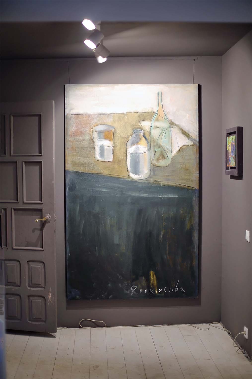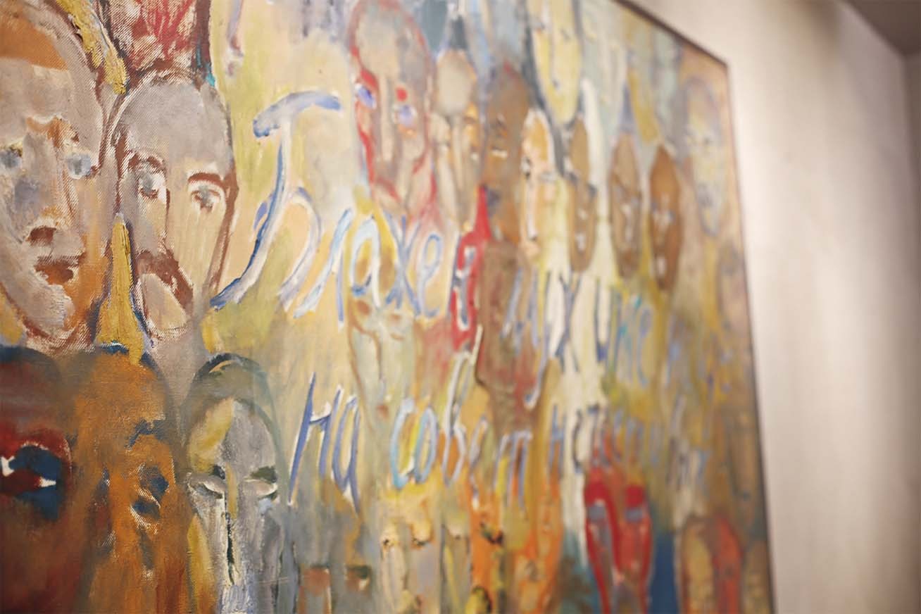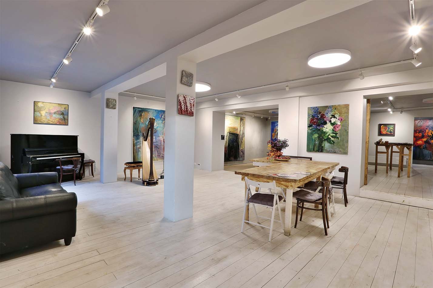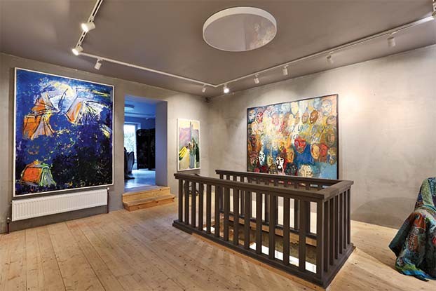 Дальше — покупка, сломанные стены, открывшееся пространство и вырытый подвальный этаж, которого изначально не было: «Я как‑то почувствовала, что галерея получится интереснее, если пространство будет развиваться, уходить вниз. На первом этаже живопись, а внизу я выставляю графику и мелкую пластику». Для любой работы нужно уединение. Как его найти маме пятерых детей? «Трудно было с маленькими, там не про работу мысли были, а просто, если тишина вдруг, если все уснули — лежишь и не шевелишься. Сейчас я ухожу в мастерскую, закрываю дверь, и никто ко мне не входит. Мне нужно полнейшее сосредоточение, внутренняя собранность, которая не всегда наступает. Часто перед тем, как подойти к холсту, я сижу часа два-три — договариваюсь сама с собой. Конечно, это все сложно. Для меня живопись — такая пытка постоянная».