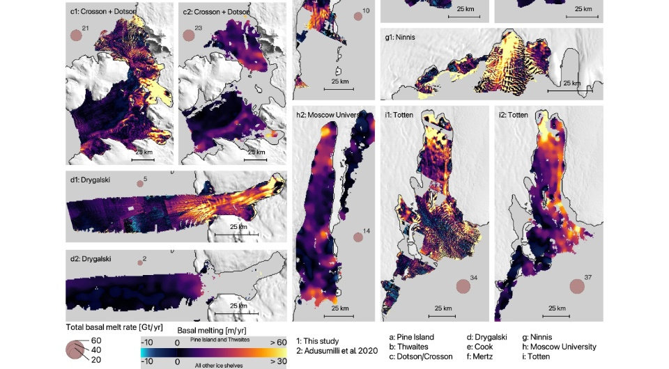 Полагаясь исключительно на радарную альтиметрию, ученые недооценивали таяние базальных каналов у основания шельфа Антарктического ледового щита на 42–50 процентов. Комбинация этого метода со стереометрическими снимками позволила установить, что средняя скорость таяния каналов достигает восьми метров в год, и многим из них грозит прорыв на поверхность ледяного щита уже через несколько десятилетий. Об этом говорится в статье, опубликованной в журнале Nature Climate Change.