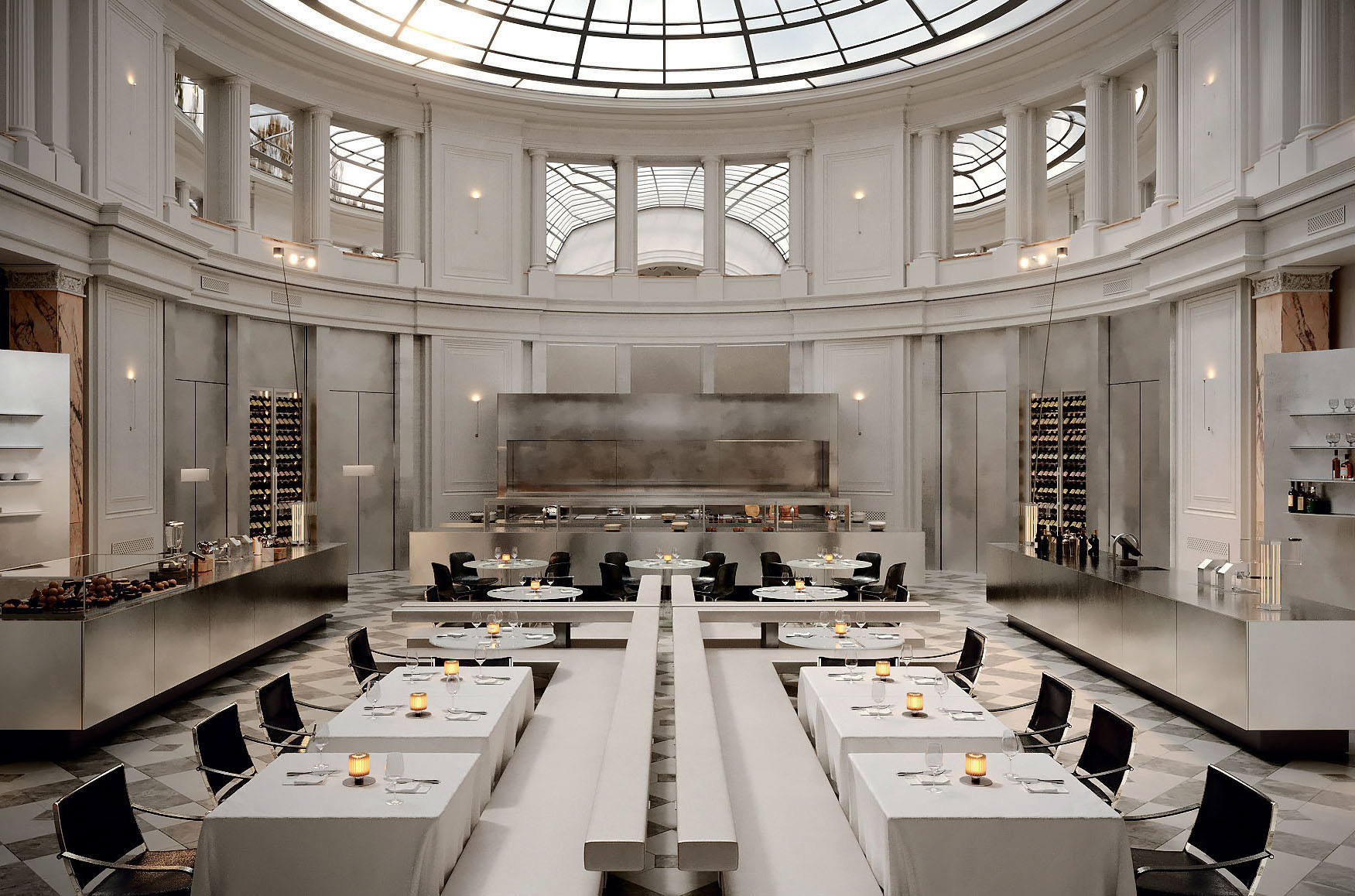 Совсем скоро откроется «Невский, 1» — проект московского ресторатора Александра Оганезова в бывшем здании Первого частного коммерческого банка. В роскошном атриуме — итальянский ресторан и винтовая лестница, которая ведет в сигарный клуб с видом на Зимний дворец, а еще огромное количество охранных обязательств и работа с КГИОП: многие элементы мы восстанавливали по архивным фотографиям. Проект уникальный по своему наполнению: винтажные кресла Joe Colombo и Carlo Scarpa, культовые барные столики Willy Rizzo, свет Viabizzuno. И сложнейшая отделка стен и потолков — великолепная работа мастерской Derevo Group.