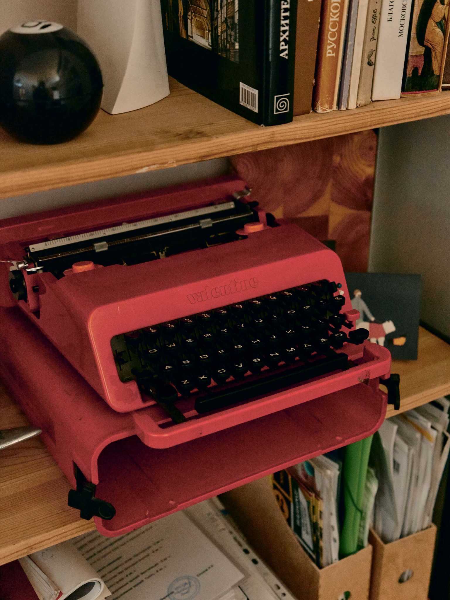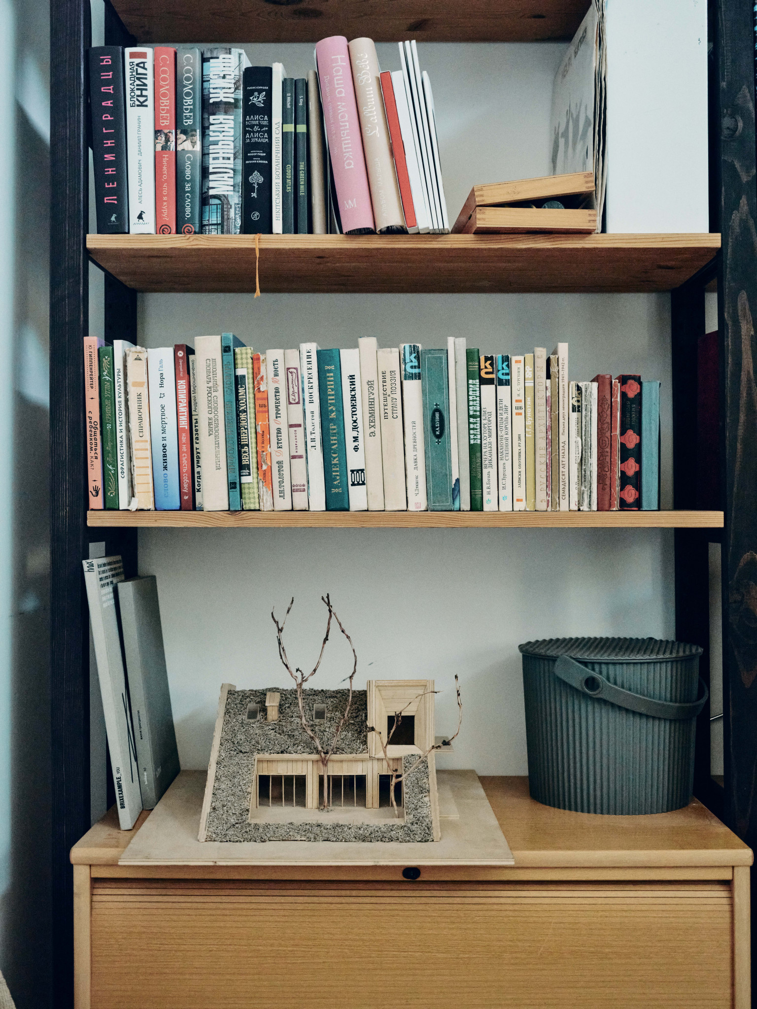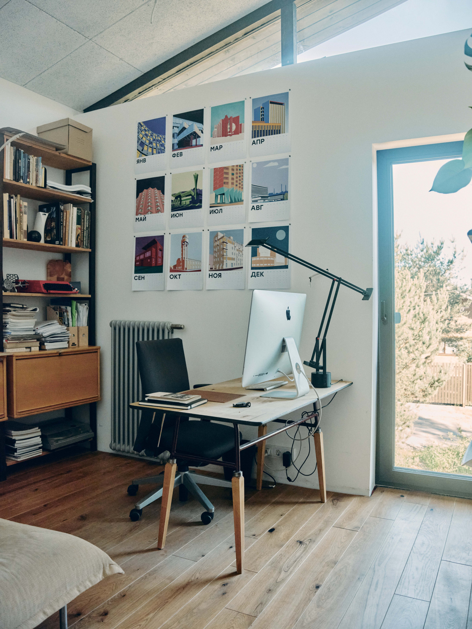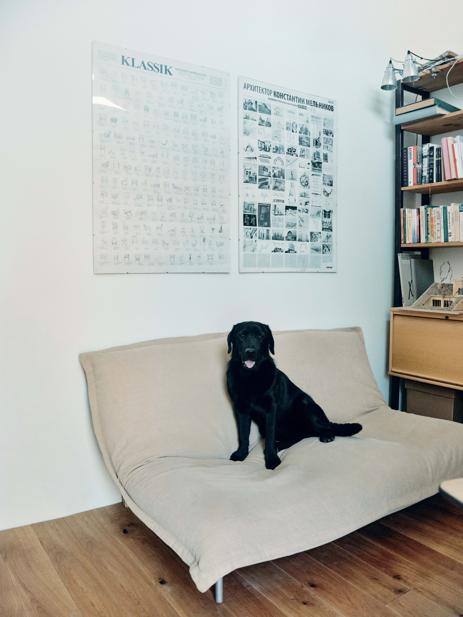 На контрасте с фасадом, мне хотелось наполнить дом объектами классического дизайна, к тому же я очень ими увлекаюсь, все время ищу на аукционах и «Авито», покупаю, реставрирую. Только что собрал стол для террасы — антикварные доски были перегородками на одном из объектов в старом фонде, а ножки когда-то купил как раз на «Авито» за четыре тысячи рублей — тащил их домой и был дико счастлив. Еще я собрал два рабочих стола — для себя и жены Наташи — из фанерных подставок подстольев для швейных машин на фабрике «Скороход»: приделал к ним ножки и получилось очень красиво. Я вообще люблю ваять мебель: сам сделал стеллажи для кабинета, а для дочерей Нины и Василисы — лошадку-качалку и кукольный домик. Я даже думал запустить их в производство, но все никак не дойдут руки. Из культовых вещей горжусь лампой Tizio Artemide Ричарда Саппера, которого я считаю лучшим промышленным дизайнером, и печатной машинкой Olivetti — у меня редкая красная Valentinе: Этторе Соттсасс, основатель группы «Мемфис», выпустил ее 14 февраля 1969 года, она входит в коллекции всех лучших музеев дизайна. Алый диван Ploum от братьев Буруллеков для Ligne Roset пал жертвой лабрадора Наоми, кажется, нам придется его перетягивать. Уличные стулья — от Гастоне Ринальди, на металлические квадраты его вдохновили продуктовые корзины. Детские стулья у нас Stokke, этот бренд делает еще и классные коляски. Из русских дизайнеров у нас есть стул моего однокурсника Александра Каныгина, он стал предметным дизайнером. Особенно мы ценим вещи, доставшиеся нам от родственников, у меня есть колокол, отлитый в 1865 году, кстати, он отлично бы подошел в качестве сигнала к обеду, а у Наташи от бабушки, заведующей отделением Византии и Ближнего Востока в Эрмитаже, оказались буфеты и кресло Isku, от прабабушки — настенные часы.