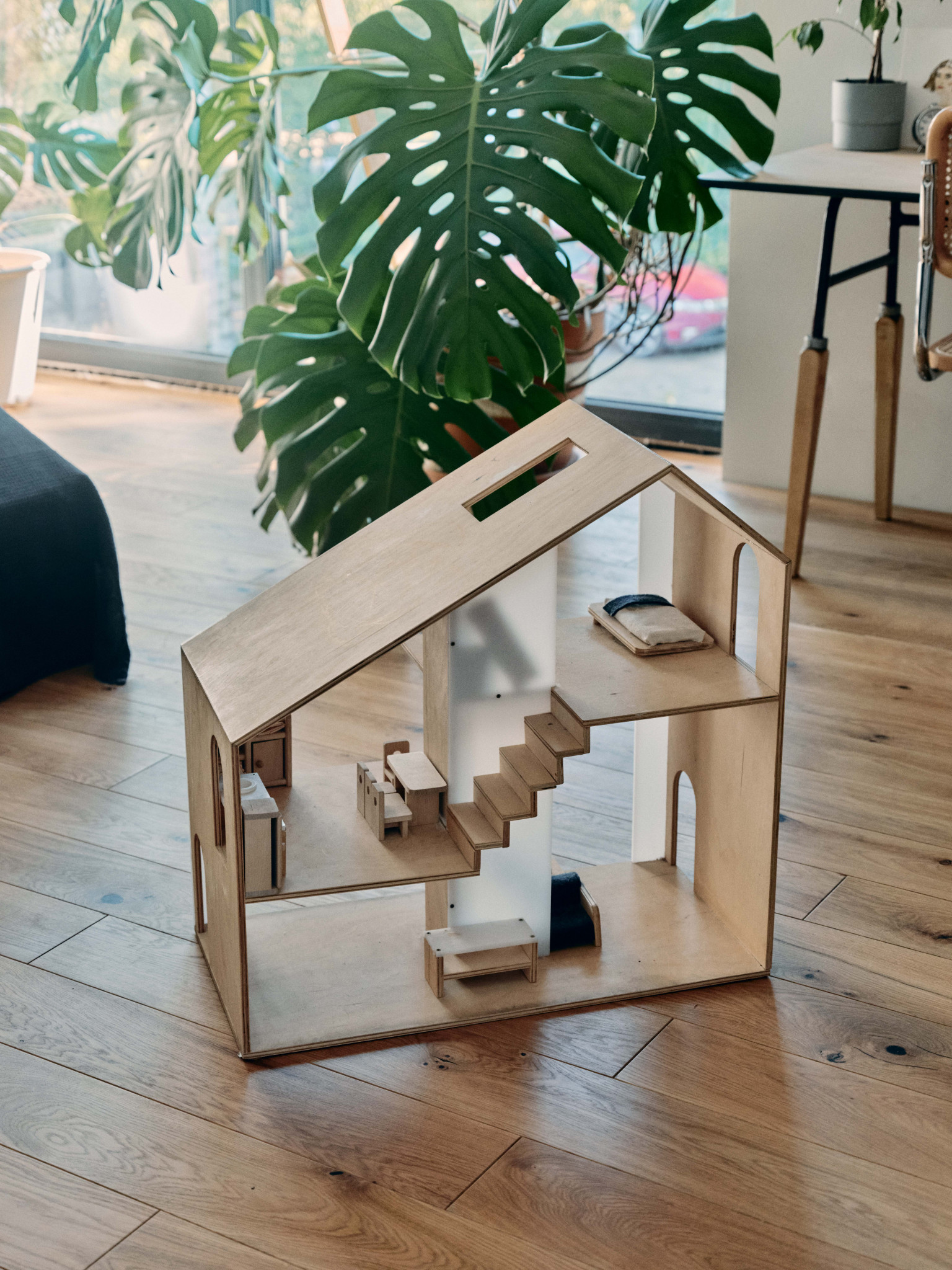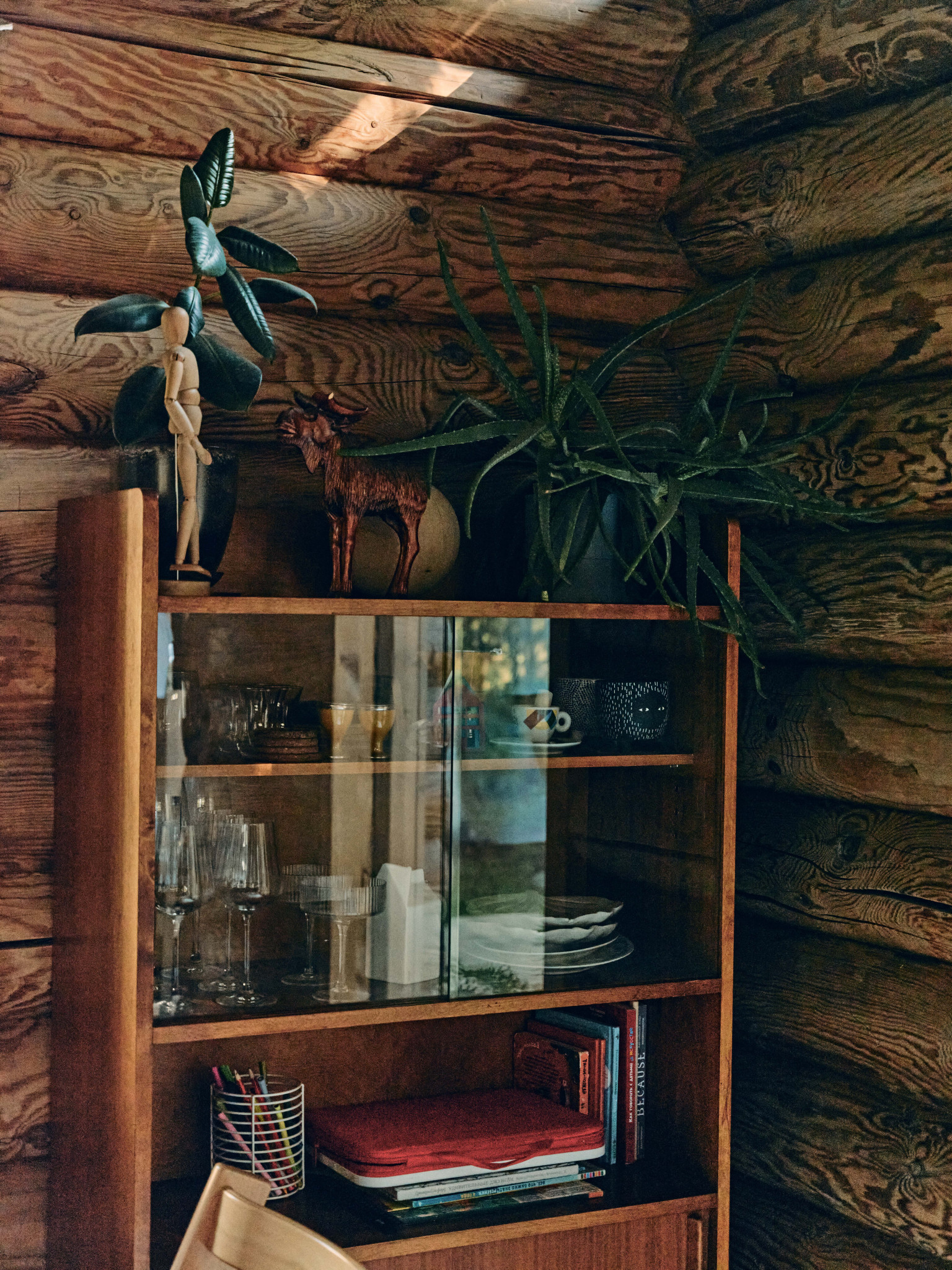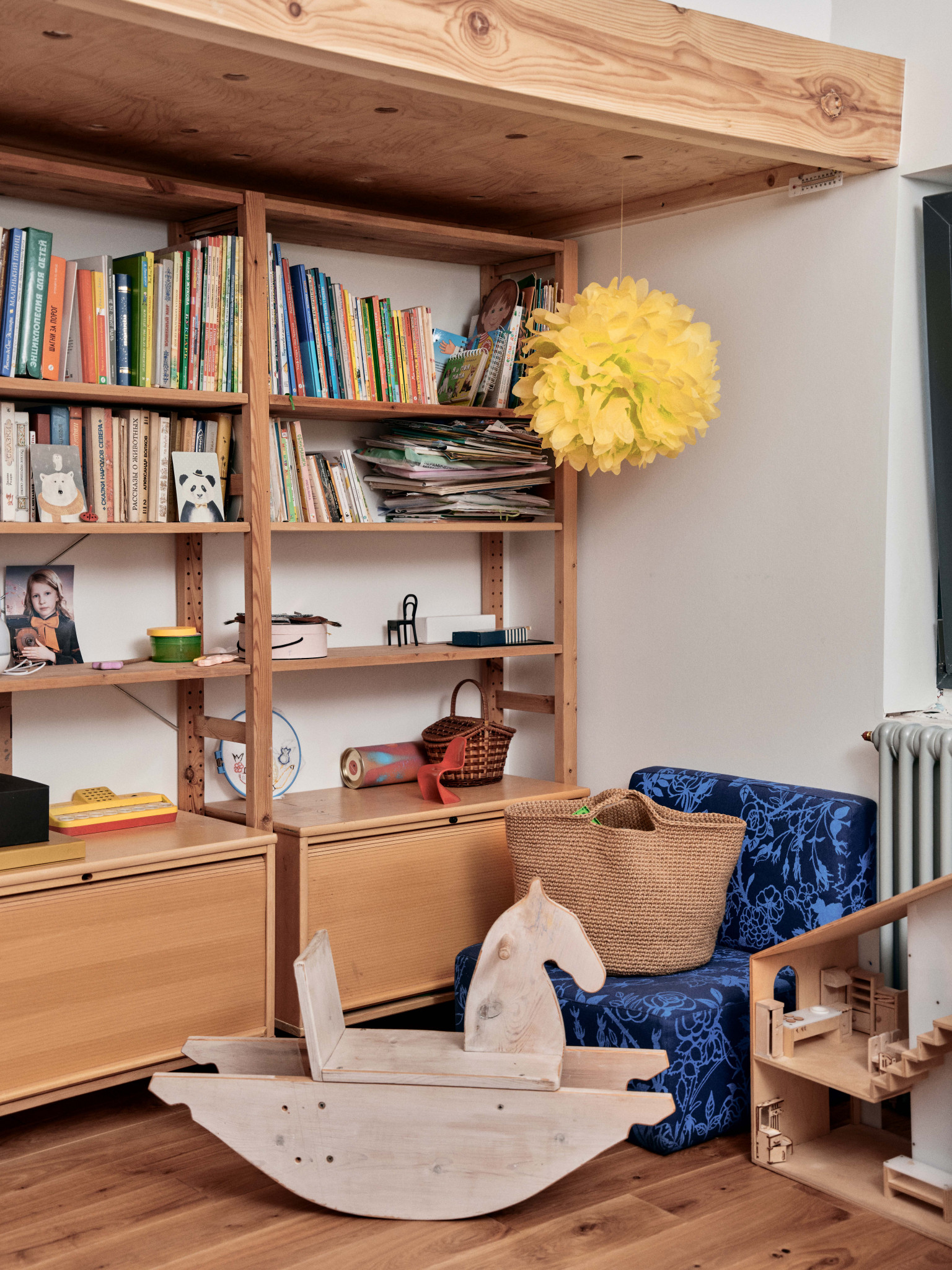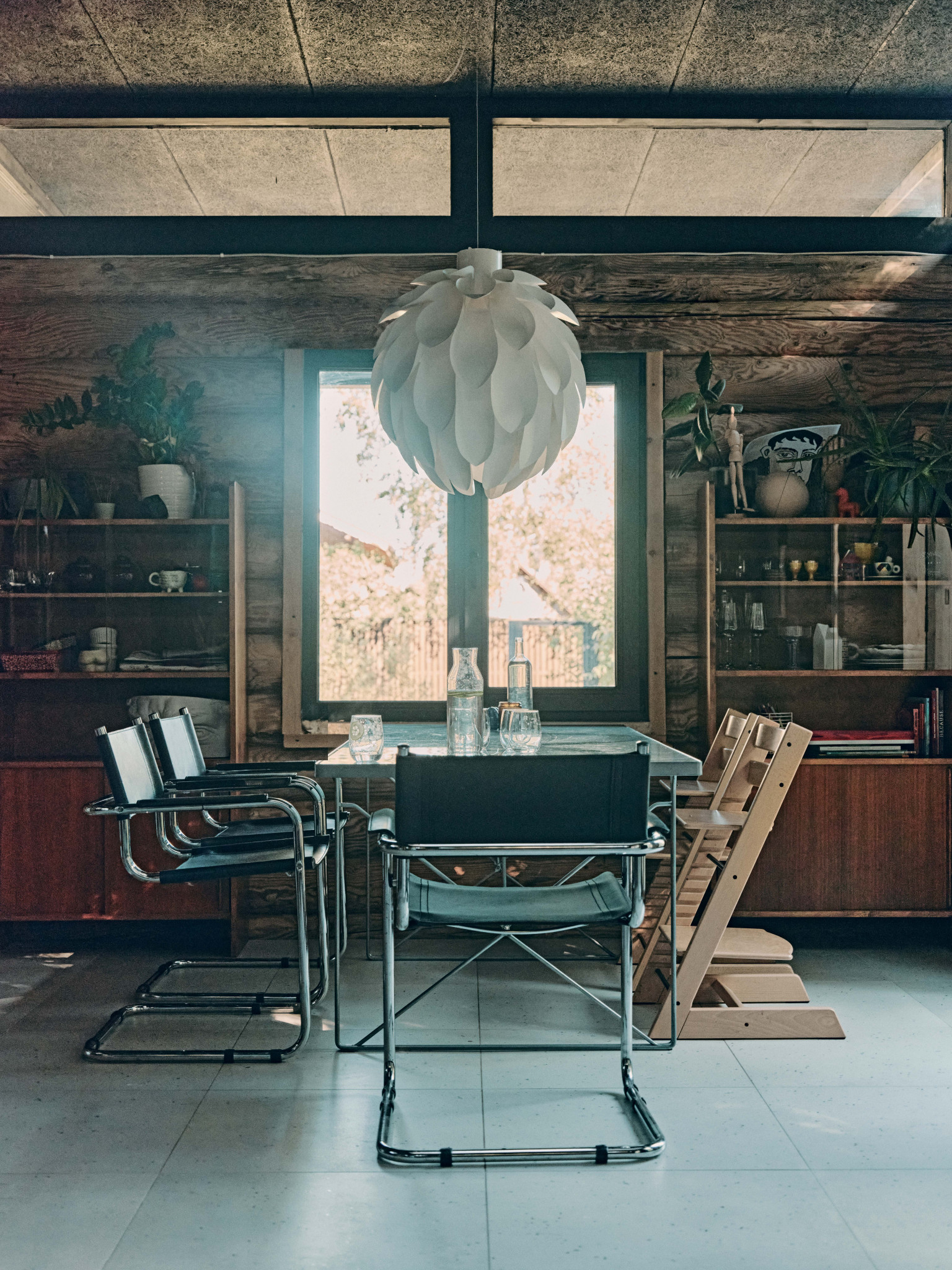 На контрасте с фасадом, мне хотелось наполнить дом объектами классического дизайна, к тому же я очень ими увлекаюсь, все время ищу на аукционах и «Авито», покупаю, реставрирую. Только что собрал стол для террасы — антикварные доски были перегородками на одном из объектов в старом фонде, а ножки когда-то купил как раз на «Авито» за четыре тысячи рублей — тащил их домой и был дико счастлив. Еще я собрал два рабочих стола — для себя и жены Наташи — из фанерных подставок подстольев для швейных машин на фабрике «Скороход»: приделал к ним ножки и получилось очень красиво. Я вообще люблю ваять мебель: сам сделал стеллажи для кабинета, а для дочерей Нины и Василисы — лошадку-качалку и кукольный домик. Я даже думал запустить их в производство, но все никак не дойдут руки. Из культовых вещей горжусь лампой Tizio Artemide Ричарда Саппера, которого я считаю лучшим промышленным дизайнером, и печатной машинкой Olivetti — у меня редкая красная Valentinе: Этторе Соттсасс, основатель группы «Мемфис», выпустил ее 14 февраля 1969 года, она входит в коллекции всех лучших музеев дизайна. Алый диван Ploum от братьев Буруллеков для Ligne Roset пал жертвой лабрадора Наоми, кажется, нам придется его перетягивать. Уличные стулья — от Гастоне Ринальди, на металлические квадраты его вдохновили продуктовые корзины. Детские стулья у нас Stokke, этот бренд делает еще и классные коляски. Из русских дизайнеров у нас есть стул моего однокурсника Александра Каныгина, он стал предметным дизайнером. Особенно мы ценим вещи, доставшиеся нам от родственников, у меня есть колокол, отлитый в 1865 году, кстати, он отлично бы подошел в качестве сигнала к обеду, а у Наташи от бабушки, заведующей отделением Византии и Ближнего Востока в Эрмитаже, оказались буфеты и кресло Isku, от прабабушки — настенные часы.