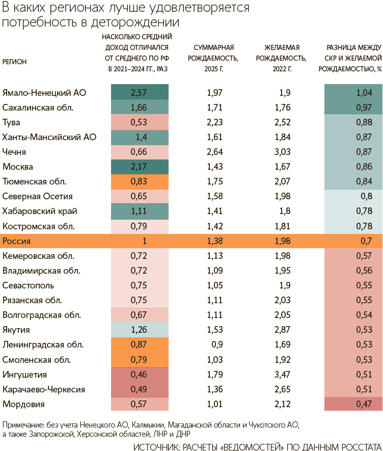 Разрыв между фактическим и желаемым числом детей оказался ниже в тех регионах, где относительно выше благосостояние, следует из данных Росстата о доходах и наблюдений репродуктивных планов, которые проанализировали «Ведомости». Лидерами оказались Ямало-Ненецкий АО, Сахалинская область, Тува, Ханты-Мансийский АО, Чечня и Москва, где почти полностью удовлетворяются планы семей. Хуже всего ситуация в Мордовии, Смоленской и Ленинградской областях, Карачаево-Черкесии и Ингушетии, где разрыв двукратный.