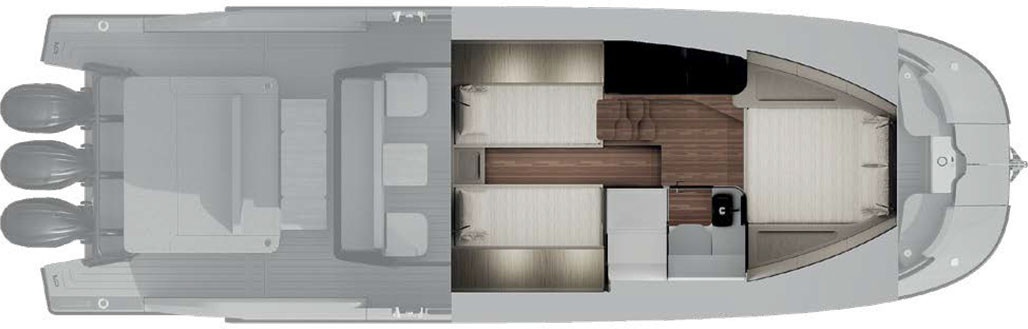 Оригинальное решение обнаруживается на носовой палубе. Вместо сходящихся «в точку» бортов здесь видишь широкое пространство, почти как на катамаране или хотя бы deck boat. На фордеке обустроены большой лежак-«солярий» и два сиденья по бортам; между ними смонтирована якорная лебедка. Планировка палубы walkaround оставляет ведущие сюда проходы по бортам. Как поясняет Роберто Дельфанти, такая неожиданно расширенная и гостеприимная зона отдыха на носовой палубе — это стилистический элемент, создающий дополнительное пространство.
