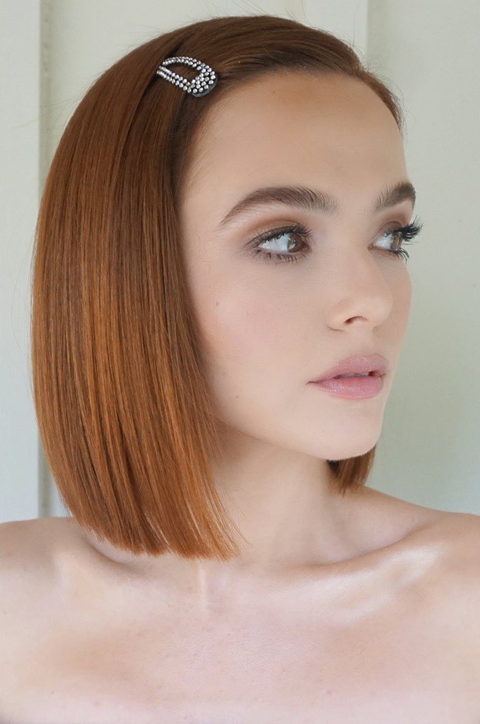 Медный оттенок может быть и более спокойным, благородным, например как у Зои Дойч. Добавь ему сияния при помощи заколки — утонченного, но супермилого аксессуара.