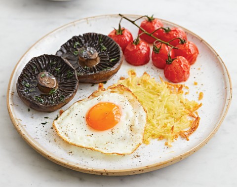 1 большая картофелина, оливковое масло, 4 шампиньона, 3 веточки свежего тимьян, 2 свежих перца чили, 12 помидоров черри на ветке, 2 яйц, 1 спелый авокадо.