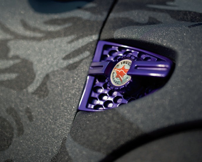 Следующий шаг в создании эксклюзива — это графика на кузове и общий дизайн. Сначала на весь автомобиль, включая грузовой отсек, бамперы и пороги, нанесли защитное покрытие Line-X. Затем уже по покрытию сделали специально разработанную аэрографию. Но это ещё не всё! Для создания дополнительных акцентов некоторые элементы кузова и суппорта были выкрашены в ярко-фиолетовый цвет.
