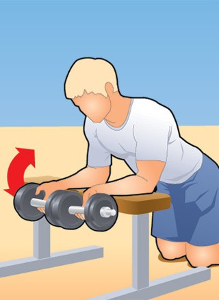 В трюке задействованы в основном сгибатели пальцев. Поэтому возьми гантели обратным хватом, положи предплечья на скамью и сгибай кисти рук, в нижней точке почти роняя гантели. Пусть они висят на самых кончиках пальцев.