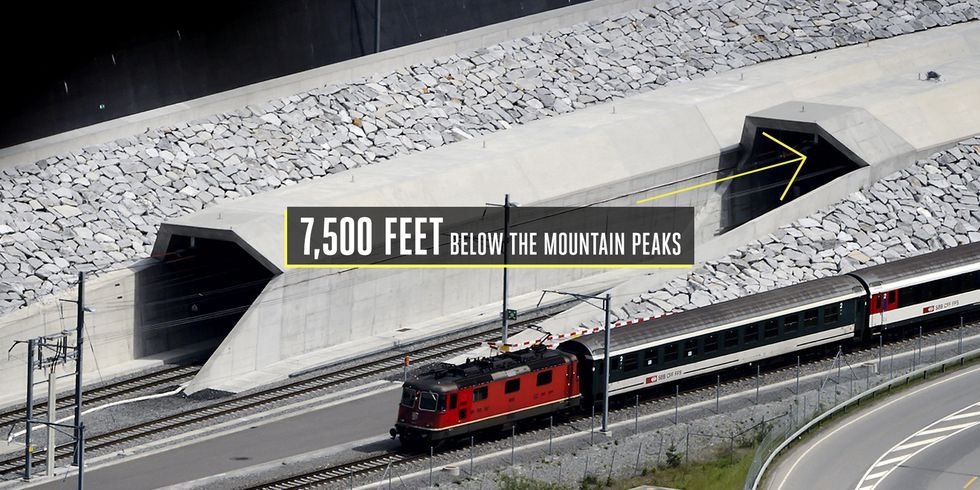 Самый длинный и глубокий железнодорожный тоннель в мире проходит прямо сквозь швейцарские Альпы. Его строительство продолжалось почти 20 лет, однако открыли его лишь в 2016 году. Это позволило отправлять прямые рейсы (пассажирские и грузовые) между Цюрихом и Миланом, теперь от одной локации до другой можно добраться всего за 2 часа 50 минут. Длина тоннеля составляет 57,1 км (включая служебные и пешеходные ходы — 153,4 км), а расстояние от горных вершин до его стен — 2280 метров.