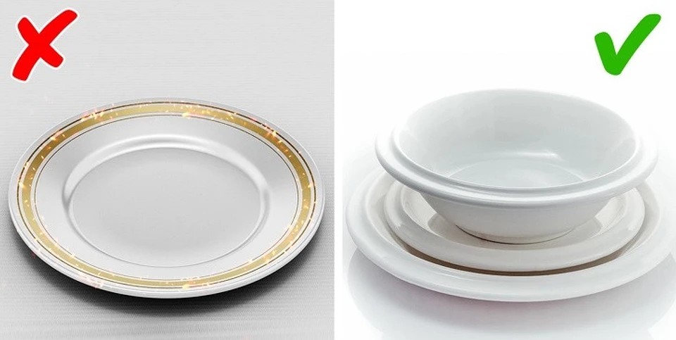 Но даже фарфоровая или стеклянная посуда может быть непригодна для микроволновки. Многие тарелки имеют каемки с напылением из металла - такие покрытия тоже могут вызывать искрение. Конечно, не факт, что любая посуда с каемками и ободками - металлизированная, но лучше избегать использования таких предметов в микроволновой печи.