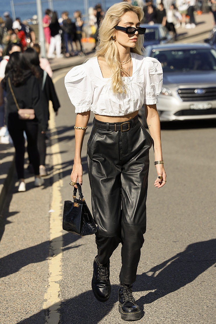 Хлопковый белый топ с пышными рукавами - то, что вы найдете практически в любом магазине в этом сезоне. Это могут быть укороченные модели или классической длины, с вышивкой, сборками или вовсе без декора. Сочетать такую вещь лучше всего с чем-нибудь брутальным: если на улице прохладно, подойдут кожаные брюки с завышенной талией, а если тепло, смело надевайте серую джинсовую юбку с необработанными краями.