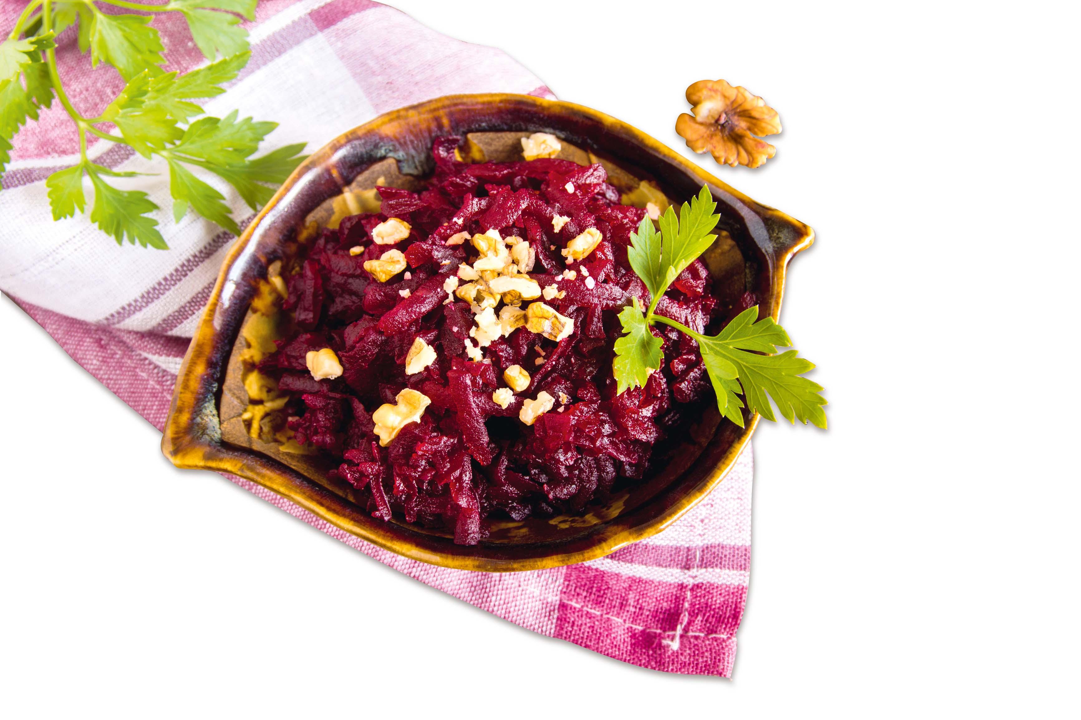 Свеклу помойте, очистите и натрите на крупной терке. Лук мелко нарежьте и обжарьте до золотистого цвета. Добавьте натертую свеклу, кориандр, соль и перец, все перемешайте и продолжайте обжаривать примерно 10–15 минут до готовности свеклы. За 2–3 минуты до того, как снять блюдо с огня, добавьте мелко нарезанный зубчик чеснока. Готовый горячий салат посыпьте измельченными грецкими орешками.