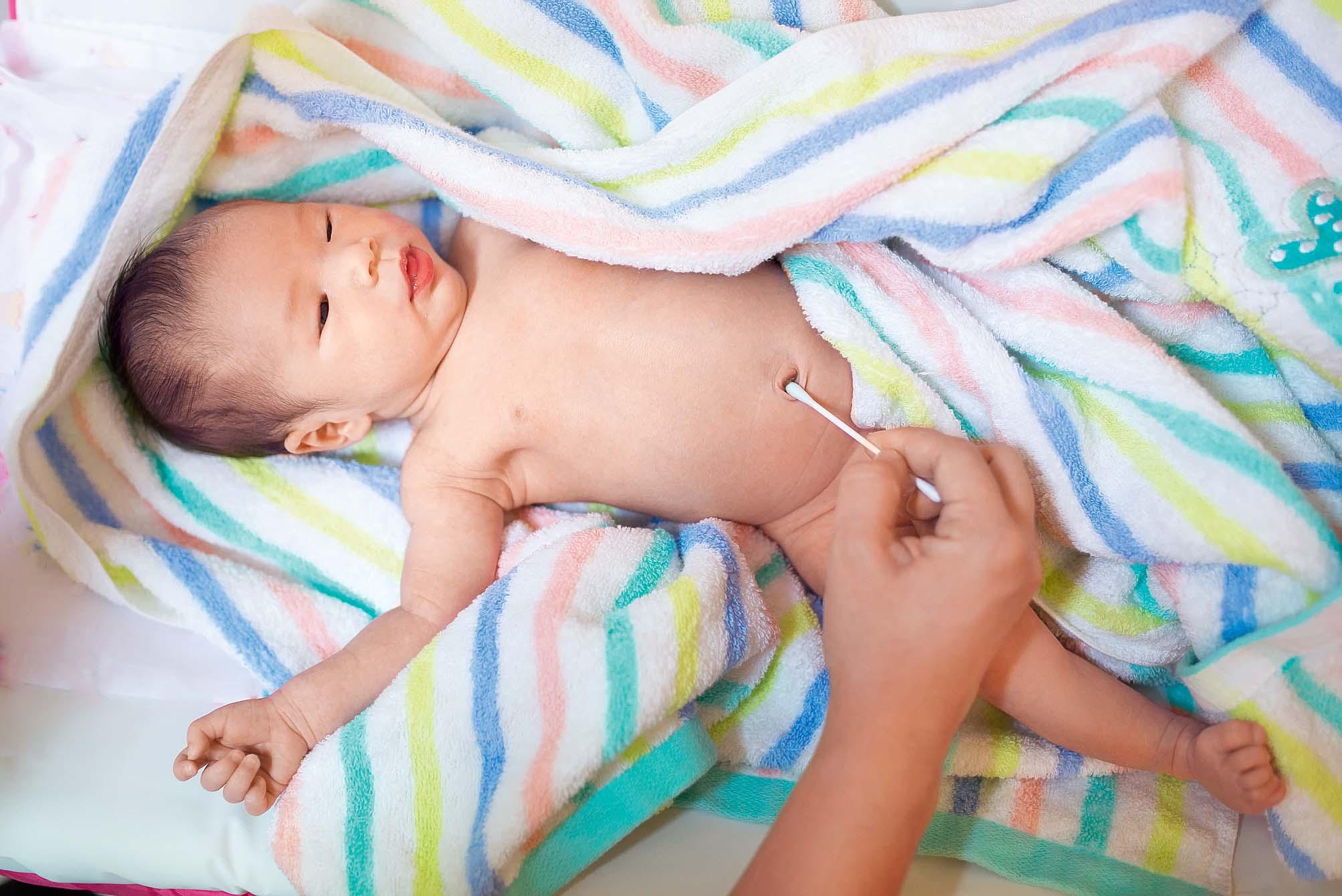 Пупок новорожденного тоже далеко не сразу приобретает привычный нам вид. После того как во время родов пуповину перевязывают, а потом и отсекают, остается пуповинный остаток, который врачи удаляют в роддоме на 2–3-и сутки. На его месте остается пупочная ранка, которая заживает примерно к 20-му дню жизни малыша. А до этого времени она требует тщательного ухода и бережно го отношения. В роддоме детская сестра покажет, как правильно обрабатывать ранку. Для этого используется перекись водорода и антисептический раствор («марганцовка», «зеленка», раствор хлорофиллипта). Во время об работки нужно аккуратно удалять за сохшие корочки. Обрабатывать ранку нужно два раза в день утром и после купания крохи до полного ее заживления. До момента заживления пупочной ранки купать ребенка рекомендуется в детской ванночке, добавляя в воду раствор марганцовки до слабо-розового окрашивания.