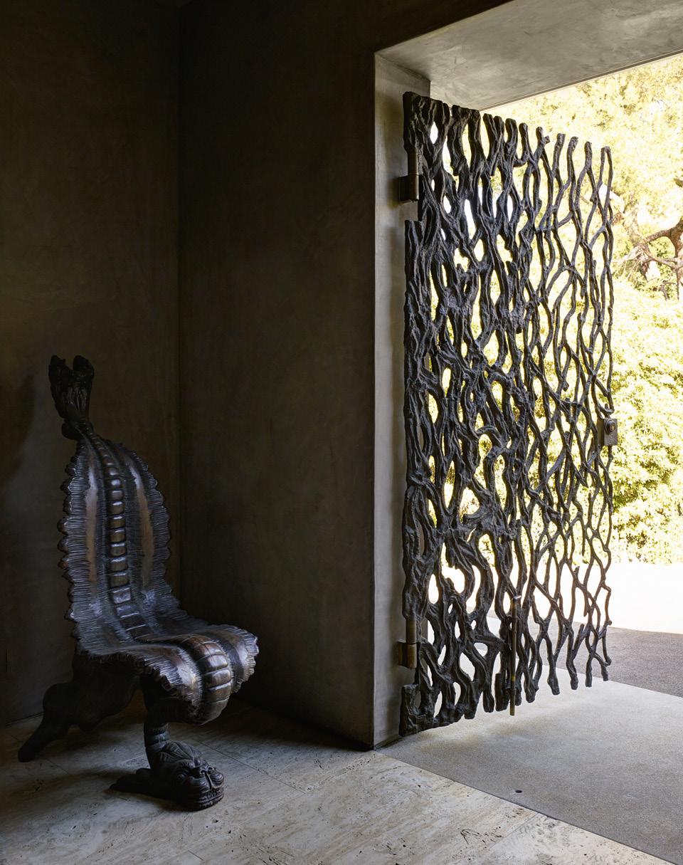 Из‑за ландшафта планировка у дома нетипичная — вход находится на верхнем уровне. Через широкие бронзовые ворота по эскизам скульптора Мэри Броггер можно попасть в фойе, а оттуда в хозяйскую и гостевую спальни. Вниз по лестнице, больше похожей на футуристичную скульптуру, расположилась двусветная гостиная. В Америке архитекторы редко оформляют интерьеры, предпочитая разделять обязанности с дизайнерами и декораторами. Но Энни Чу, взявшаяся за проект, решила, что дизайн интерьера ей по силам. Заказчику, прожившему много лет в Риме, хотелось, чтобы в его доме присутствовал дух итальянской культуры. Сделать это было не сложно, используя его обширную коллекцию предметов. К примеру, в гостиной