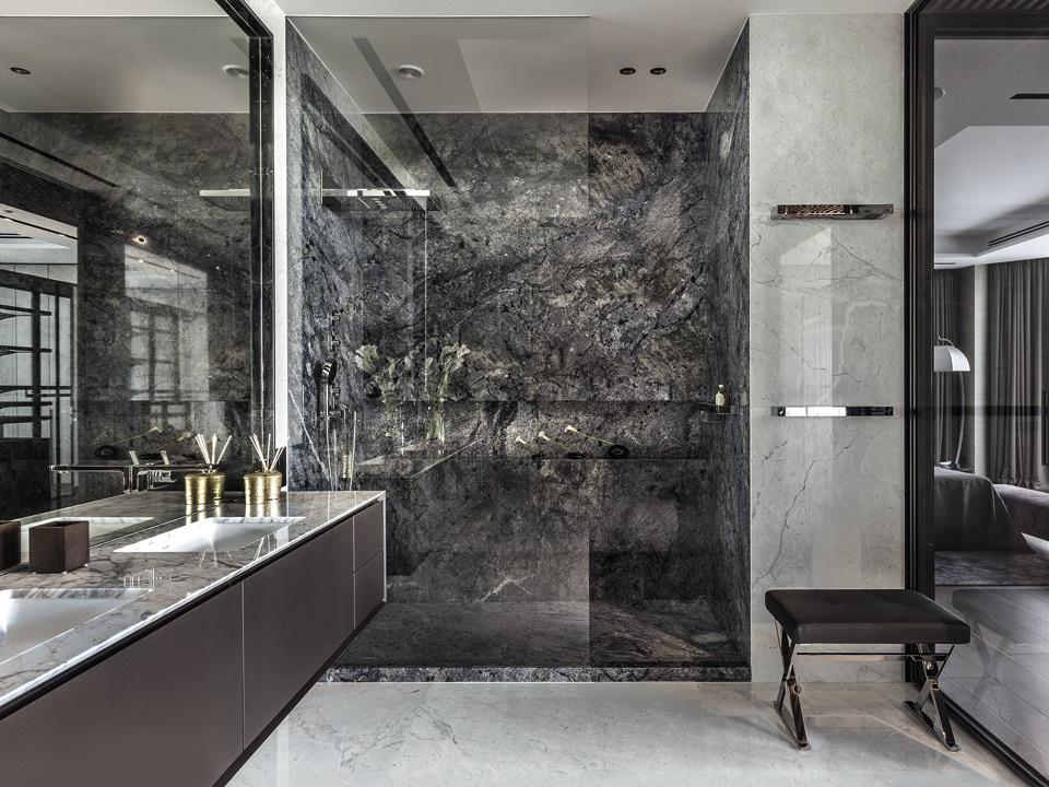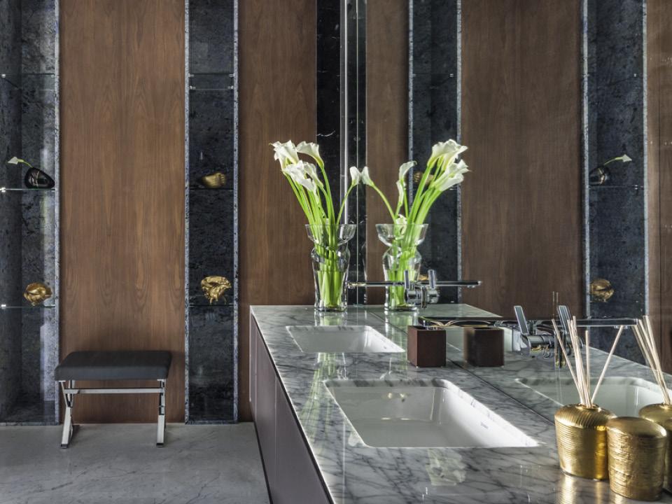 Заказчикам не нужна была ванна — только большая душевая кабина, а туалет они попросили сделать отдельно. Окон в этом пространстве нет, зато они есть в соседней гардеробной, отделенной дверями из прозрачного стекла, поэтому дневного света здесь достаточно. Как и мест для хранения: каменные ниши перемежаются с ореховыми панелями, за которыми находятся шкафы.