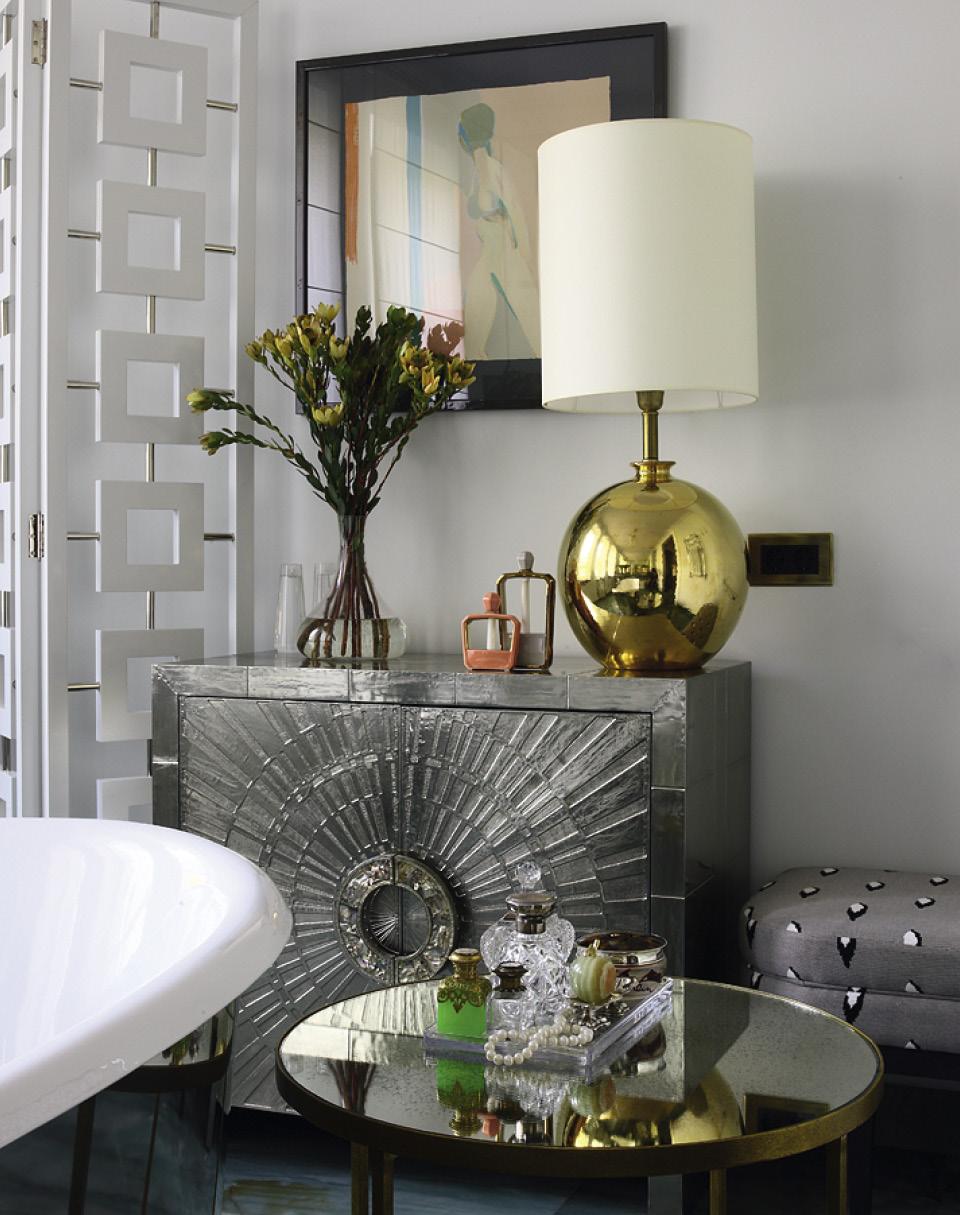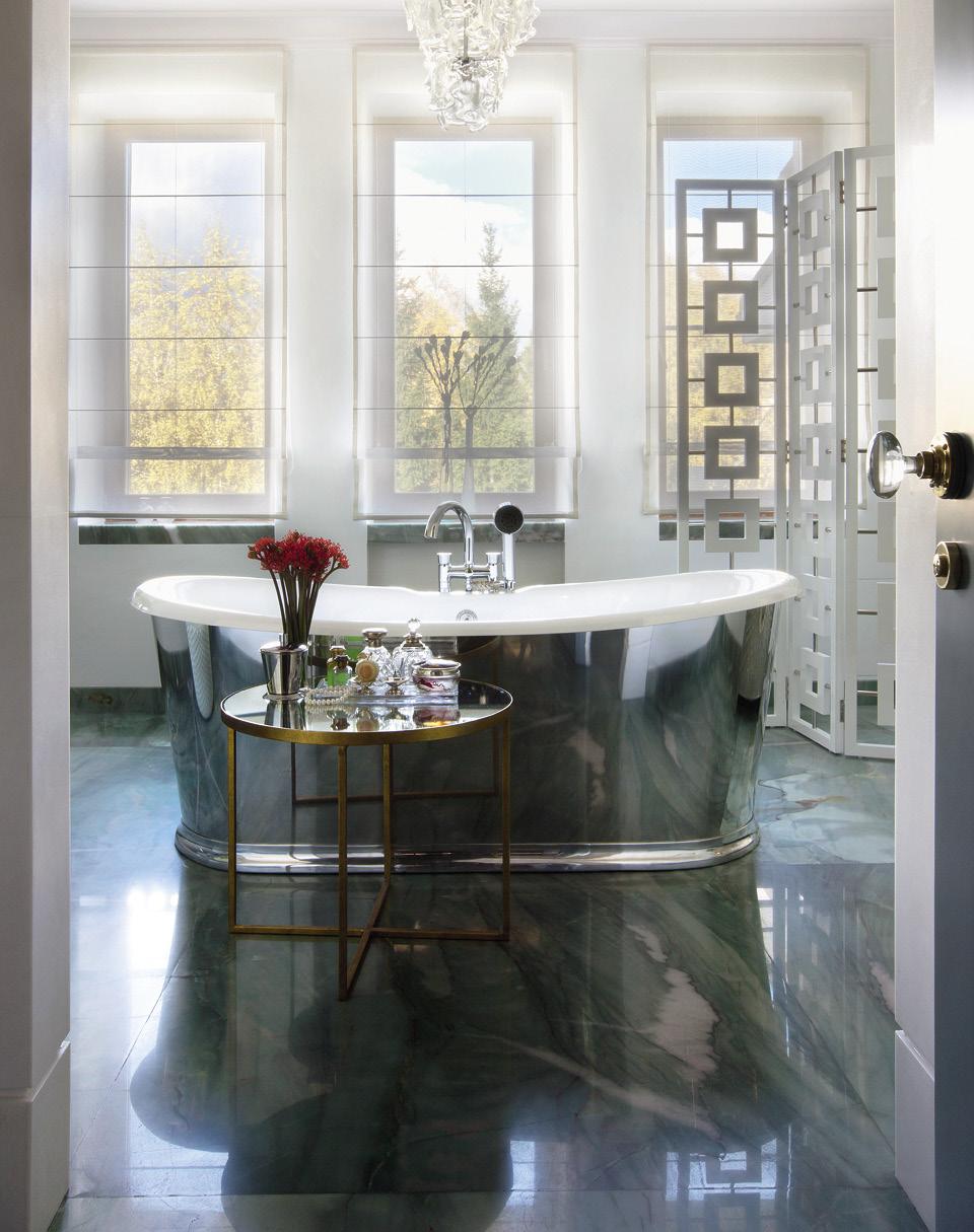 Мне нравится, когда ванная — это не просто техническое помещение, а комната со своей атмосферой и настроением, где можно читать, размышлять и отдыхать. В этом проекте она занимает два смежных пространства: при входе установлены унитаз и душ, а дальше парадная часть с ванной, винтажной люстрой и баром Jonathan Adler в роли комода. Окна — особенная удача. Я специально сделала шторы эфемерными, чтобы солнечный свет заливал пространство. Ванна отделана металлом, и в ней отражается зеленый кварцит, напоминающий по цвету морскую воду.