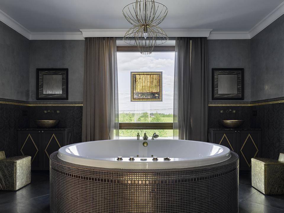 За атмосферу и цветовую гамму здесь отвечают отделочные материалы: венецианская штукатурка, плитка с фактурой дерева и каменная мозаика. Но главный элемент пространства — круглая ванна. По сторонам от нее расположились две зоны для умывания. Подстолья для раковин сделаны нашими мастерами и украшены ромбами из дерева с резьбой, имитирующей мозаику. Правая тумба с секретом: в нижней части скрыт бельепровод, по которому можно скидывать вещи прямо в прачечную, расположенную ниже.