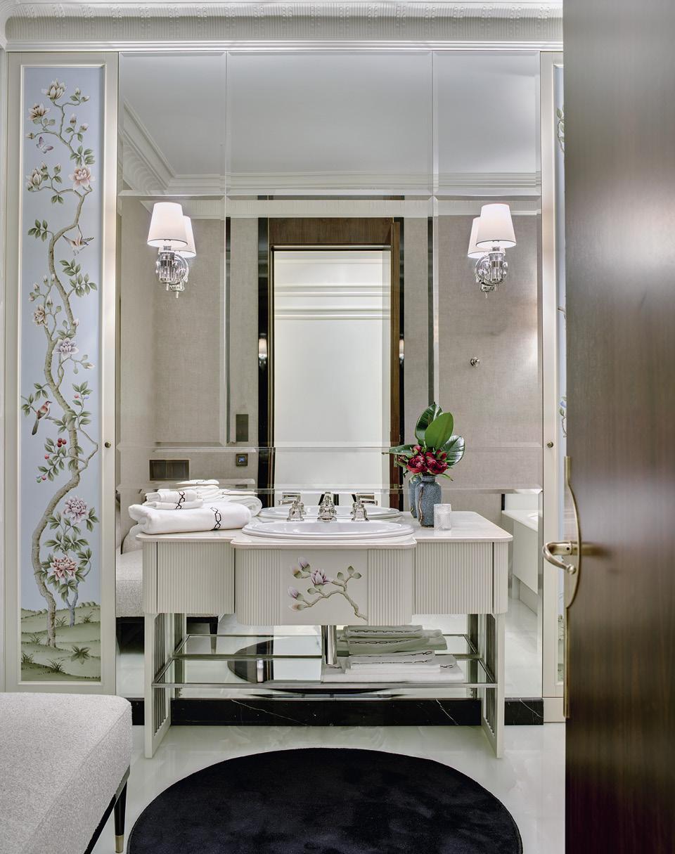Площадь ванной комнаты двенадцать с половиной квадратных метров, поэтому здесь спокойно уместились и ванна, и душевая кабина. Нашлось место даже для небольшой кушетки, она сделала утилитарное помещение более уютным. Комната оформлена в том же стиле, что и вся квартира. Для отделки не побоялись использовать шелковые обои с ручной росписью и мотивами шинуазри, которые также встречаются в спальне. Подстолье для раковины сделано по моим эскизам, на нем воспроизвели фрагмент обоев.