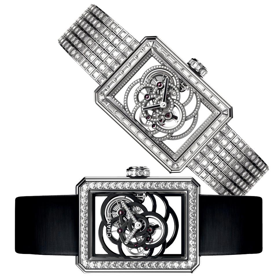 Новинка Chanel — коллекция часов Première Camélia Skeleton с собственным механизмом Calibre 2, который точно вписан в очертания ажурной камелии. Модель с бриллиантовым браслетом выпущена лимитированной серией из двенадцати экземпляров, а часы на атласном ремешке хоть и не лимитированы, но все пронумерованы.