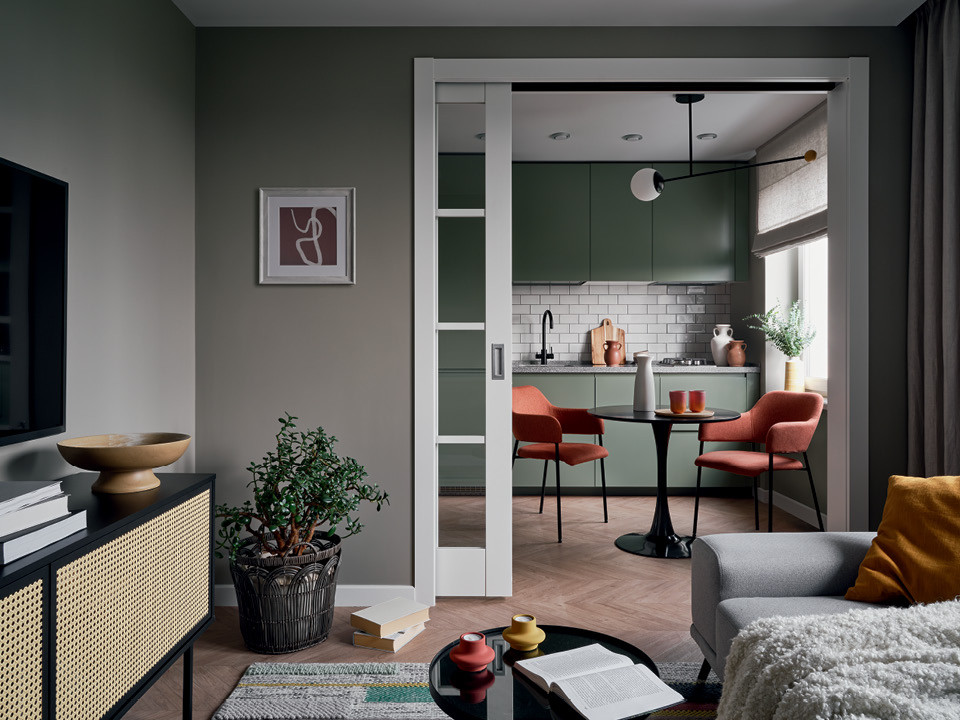 “Несмотря на связанные с пандемией сложности, работа над этой квартирой шла легко и гладко”, — вспоминает Анна Силаичева. Ее заказчики, молодая пара, с энтузиазмом отзывались на нестандартные предложения дизайнера. Повезло и с планировкой: почти квадратная в плане, квартира занимает угловую часть здания, а из окон открывается неплохой вид. Стандартную двушку Анна превратила в студию с отдельной спальней, однако предусмотрела возможность изоляции кухни: в стене между кухней и гостиной она прорезала широкий и высокий проем для раздвижных дверей.