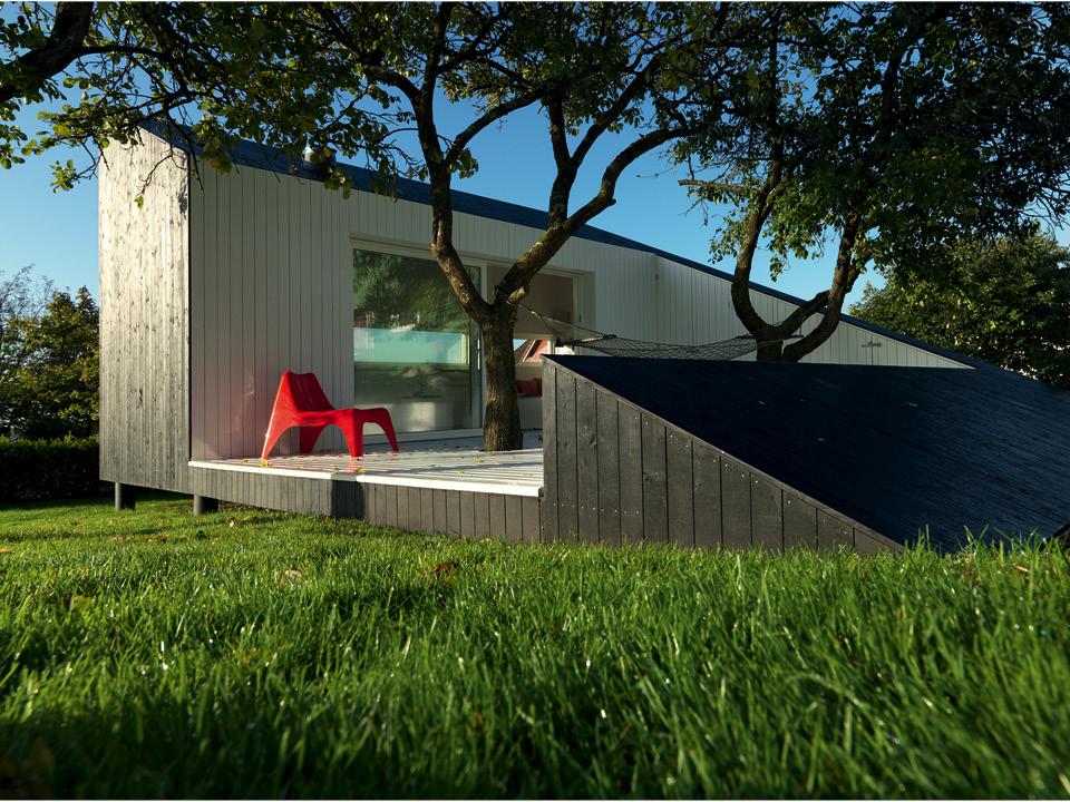Домик, расположенный в окрестностях Утрехта, имеет асимметричный фасад, подчеркивающий присущую ему двойственность. В этом проекте смешались традиция и современная архитектура: у него традиционная форма с двускатной крышей и открытая планировка. Глухой задний фасад обшит гонтом, а передний целиком сделан из стекла и дополнен вертикальными жалюзи, которые позволяют варьировать уровень освещения в доме. Площадь домика — 40 м². Из отдельно стоящей мебели в нем только обеденный стол и кровать. Все остальное, включая душевую и туалет, прячется в шкафу, который занимает целую стену. В нем нашлось место даже для камина.