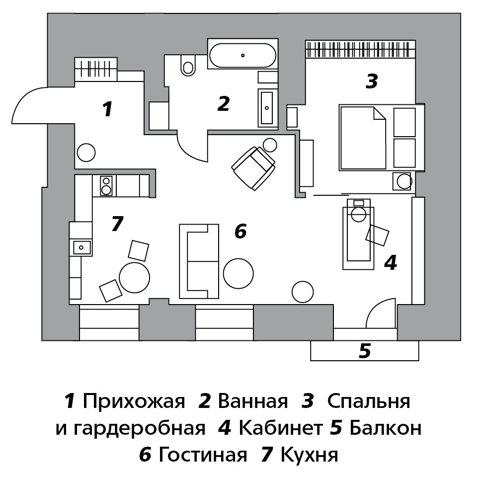 Изначально это была типичная советская квартира с двумя комнатами и небольшой кухней. Заказчица же мечтала об открытой планировке, где обособлена только спальня, чтобы в квартире чувствовался простор, было много воздуха и света. Так появилось единое цельное пространство кухни, гостиной и кабинета. Конструктивные особенности старого жилого фонда